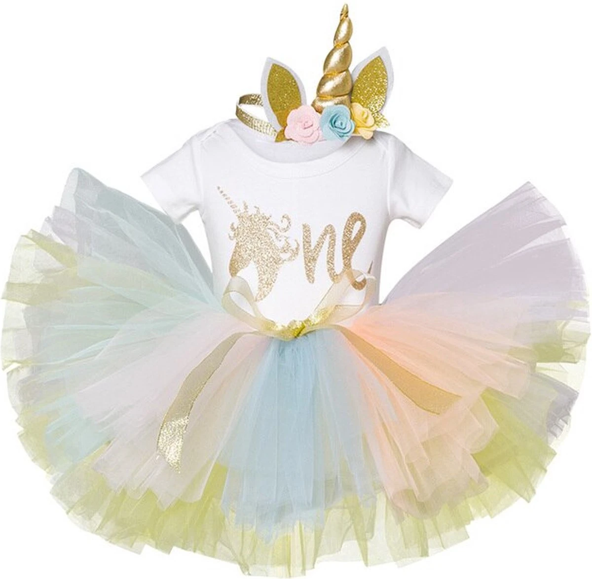 De tutu bevat pastelkleuren en is afgewerkt met een gouden satijnen strik. Ook is er een elastisch elastiek, zodat de tutu goed op zijn plek blijft.
