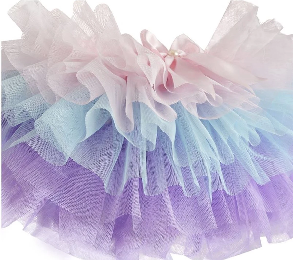 De tutu bevat de kleuren lavendel, roze en blauw en is afgewerkt met een roze satijnen strik. Ook is er een elastisch elastiek, zodat de tutu goed op zijn plek blijft.
