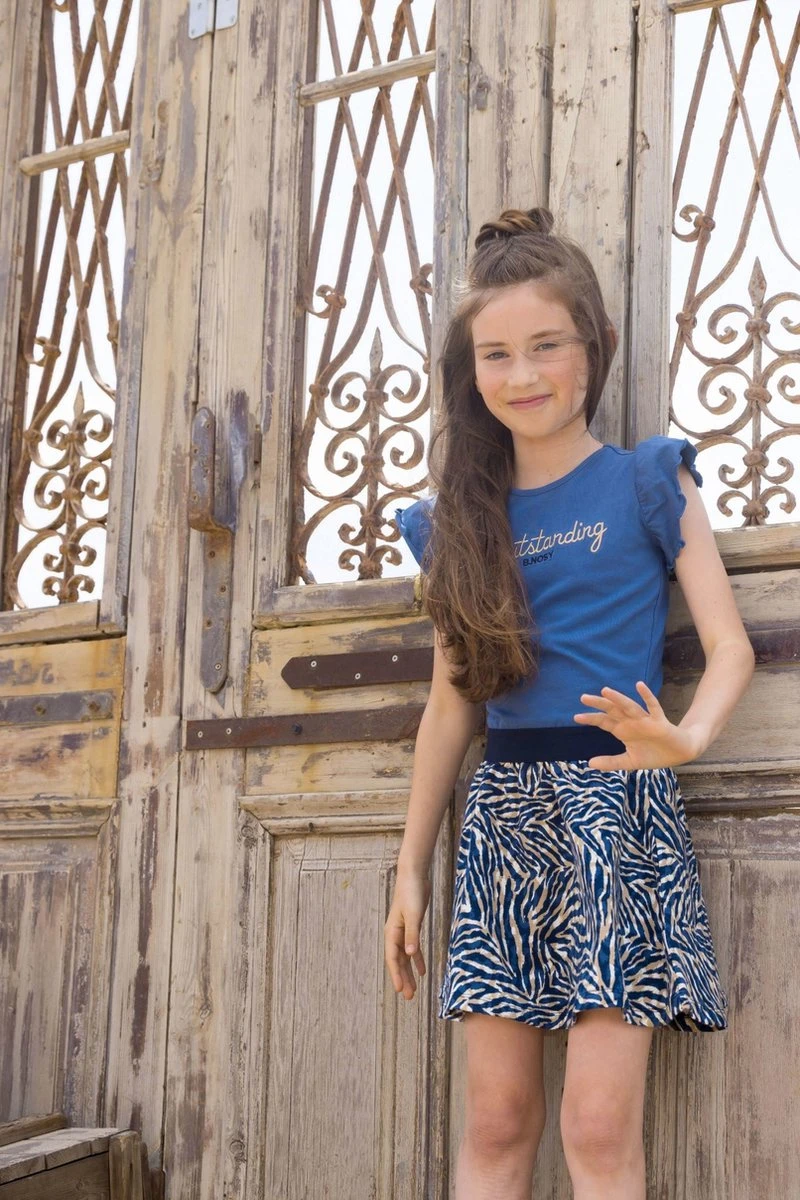 Deze B.Nosy B.Outstanding zomerjurk heeft een uni top met tekstprint, ruffle mouwen en een all-over-print wijd vallende rok. Voorzien van elastische tailleband.