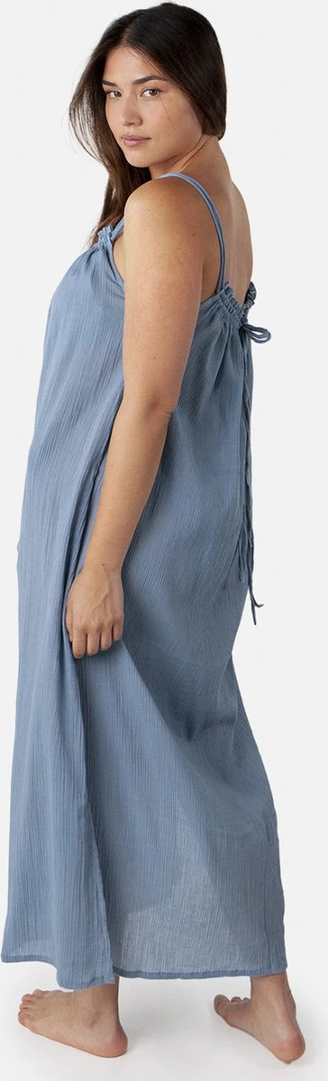 De Delphina Jurk is een lange jurk gemaakt van een gekreukte katoenen stof. Het koordje kan zowel aan de voorkant als aan de achterkant worden gedragen, wat de jurk speels maakt.
