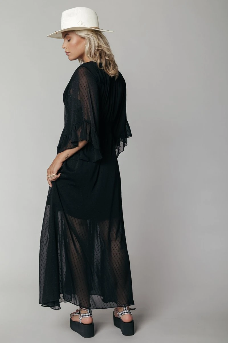 Kimono jurkWijduitlopende fitLange lengte3/4 mouwWrap sluiting zijkantmet zilveren CR logo trim 100% polyester, chiffonNon stretch stofBinnenstebuiten machinewas 30°, niet in de droger, strijken of stomen op lichte temperatuur, niet bleken, wassen met gelijke kleurenModel is 1.68m en draagt S