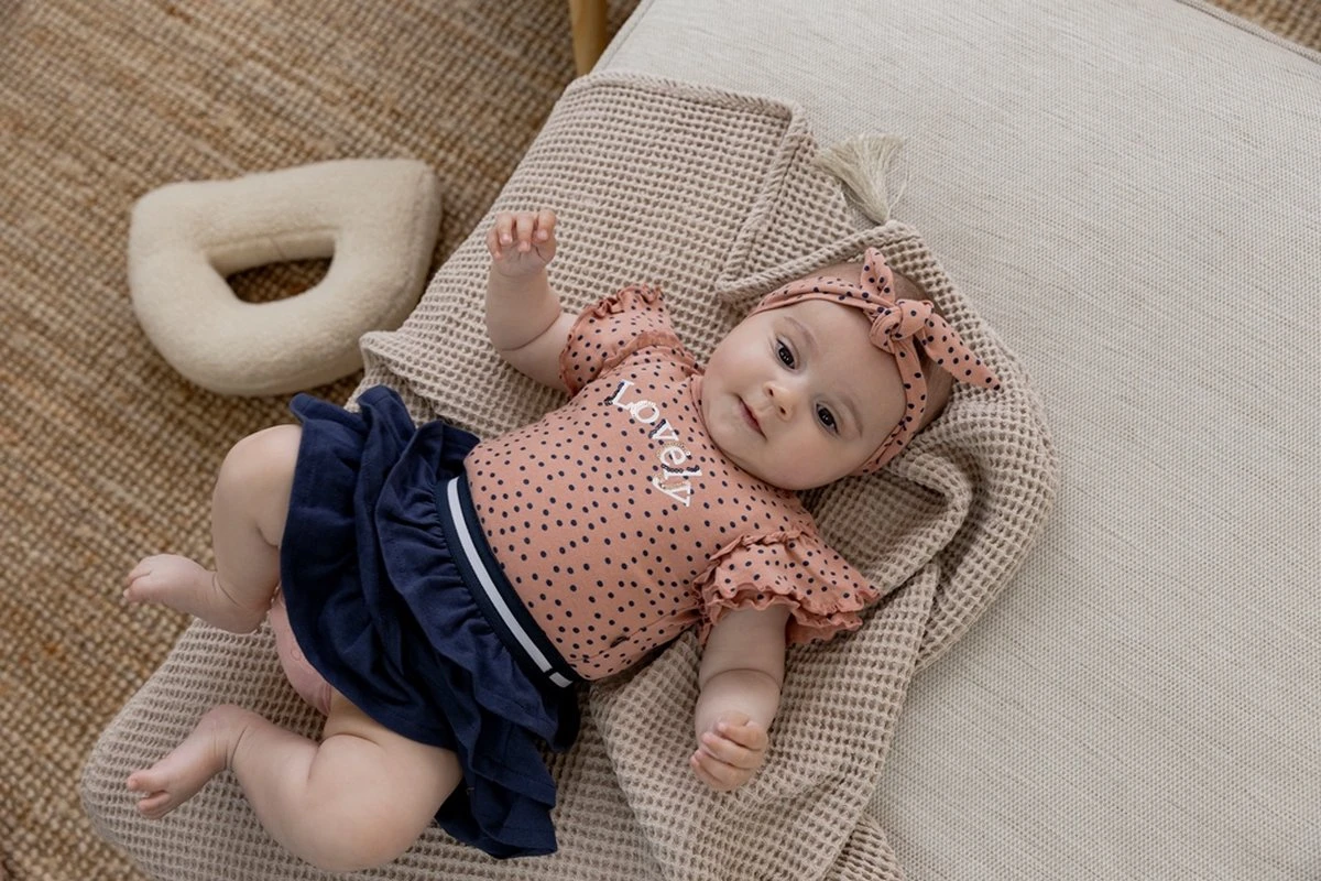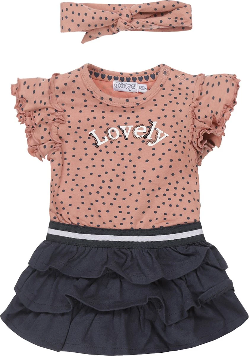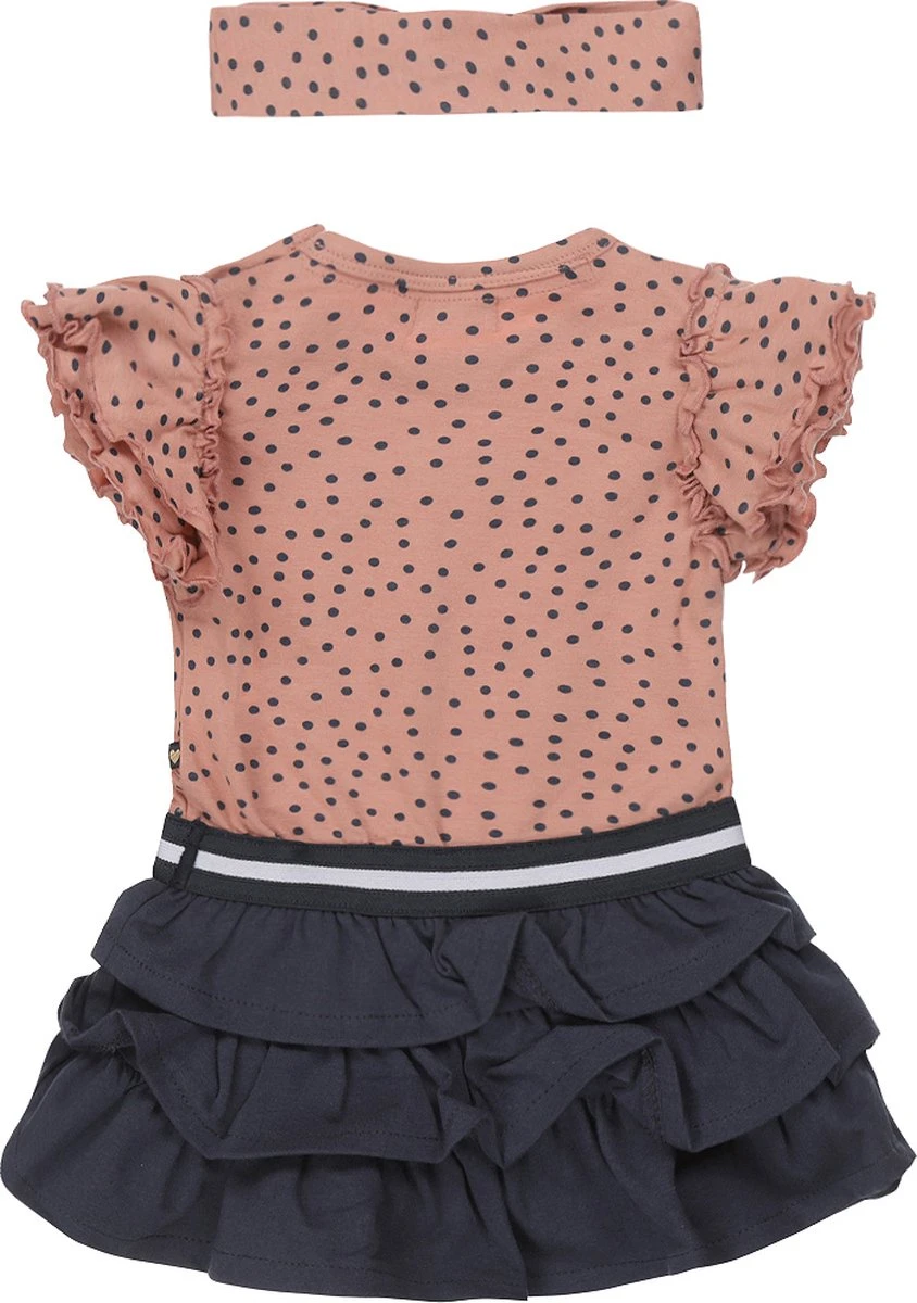 Schattig jurkje van Dirkje. De rok is navy van kleur en heeft meerdere lagen. De top is roze met navy stippen en heeft leuke ruches aan de mouwtjes. Maak je outfit helemaal compleet met de matchende hoofdband!