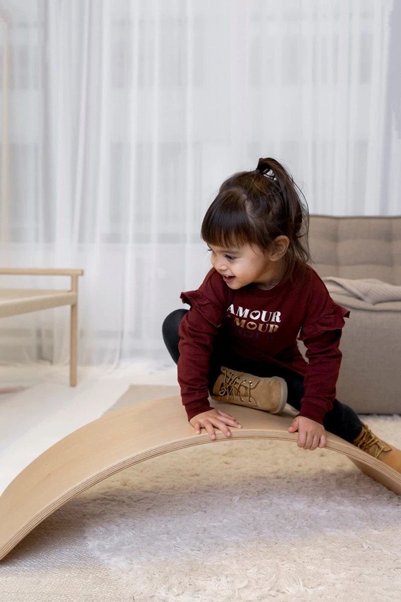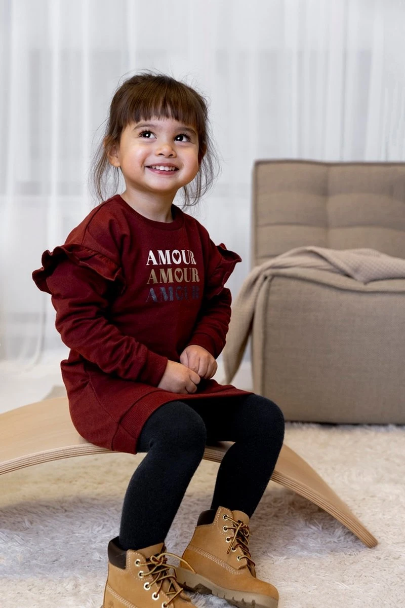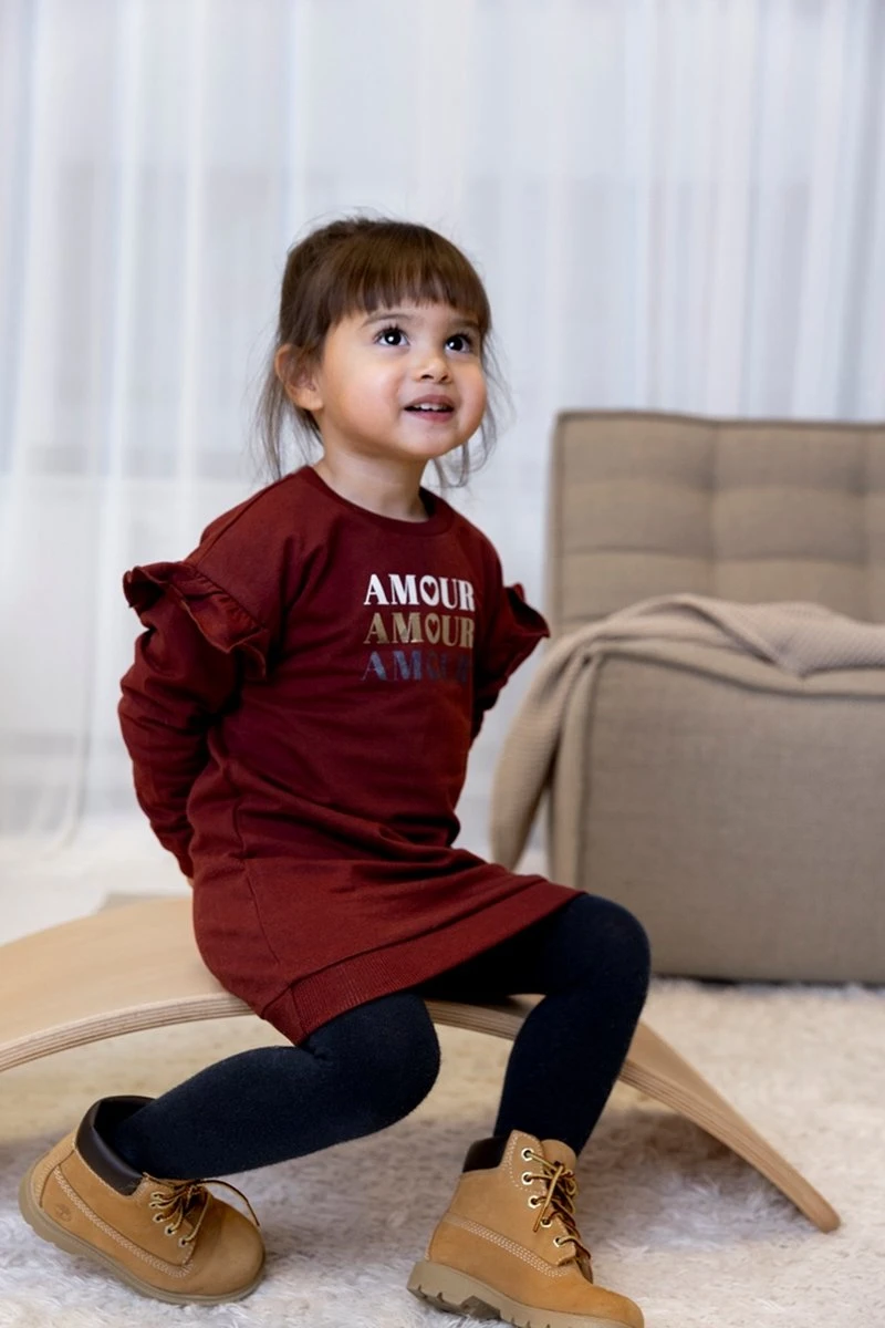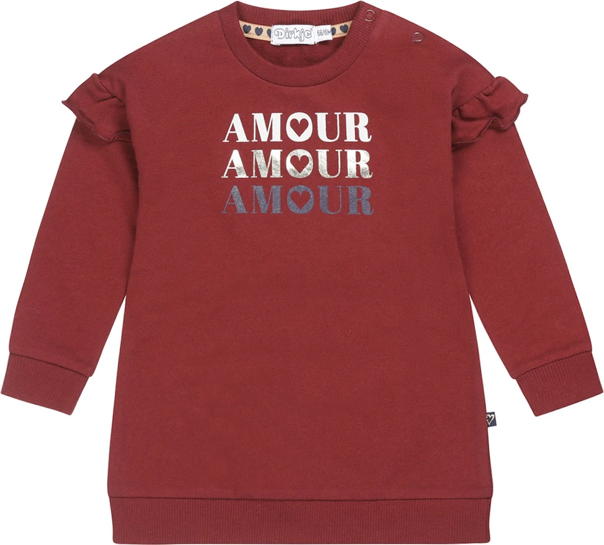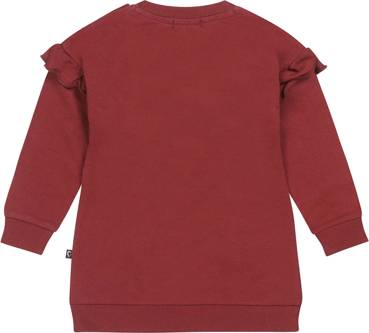 Een jurkje dat altijd kan, deze Dirkje jurk voor meisjes. Het jurkje met lange mouwen in een bordeaux kleur heeft een mooie print met een subtiel glansje. De jurk heeft sportieve boorden in de hals, mouwen en aan de onderkant van de jurk en is afgewerkt met ruffles over de arm. De maatjes tot en met 86 sluiten met drukkers op de schouder.