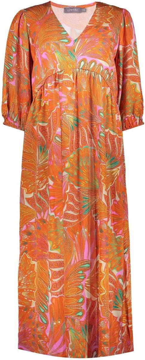 Kleurrijke jurk van Geisha met een allover paisley patroon. De driekwart mouwen hebben een elastische zoom. Dit model heeft een V-hals en twee steekzakken aan de voorkant. De totale lengte is 130 cm bij maat S/36. Lauw strijken max 110°c, Machinewas 30°c fijne was, Niet bleken, Niet in de droger, Stomerij