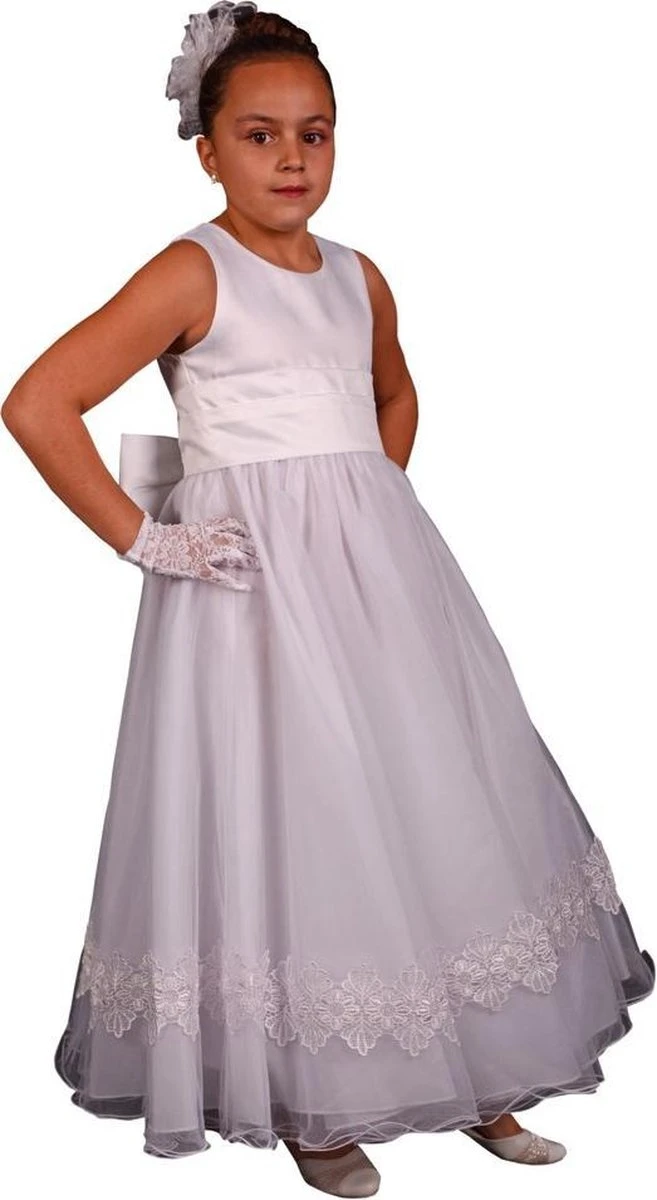 Klassieke communie jurk van katoen en tule. Model gedecoreerd met kant onder de jurk, en grote lint om de taille met satijne strik op de rug.