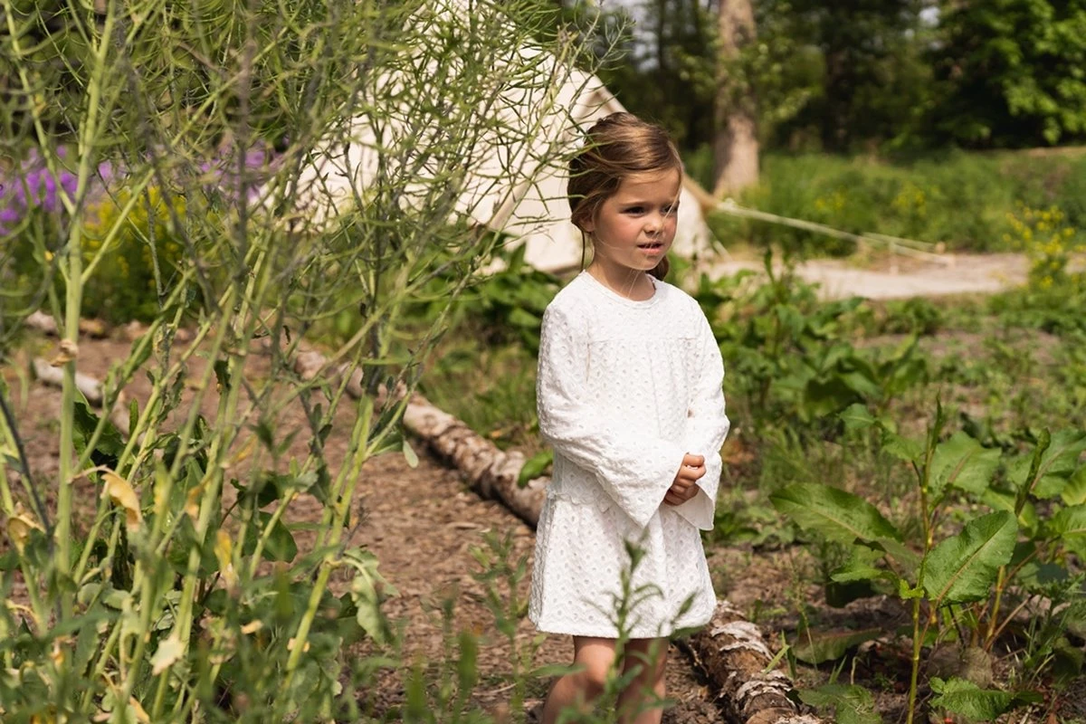 Schattige jurk van Koko Noko. Dit broderie jurkje is gebroken wit van kleur en heeft ruches op de heup en is wat wijder bij de pols.
