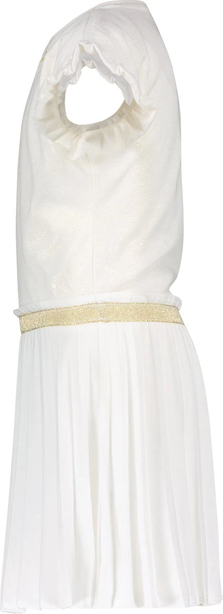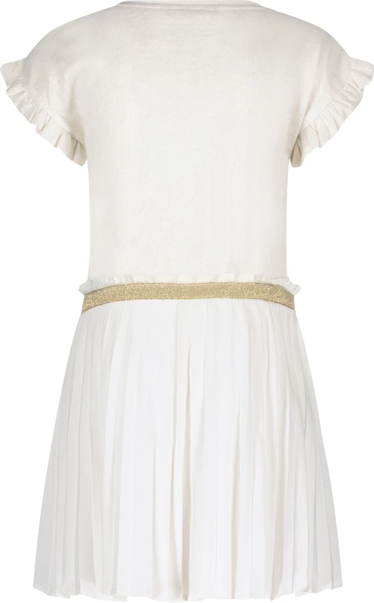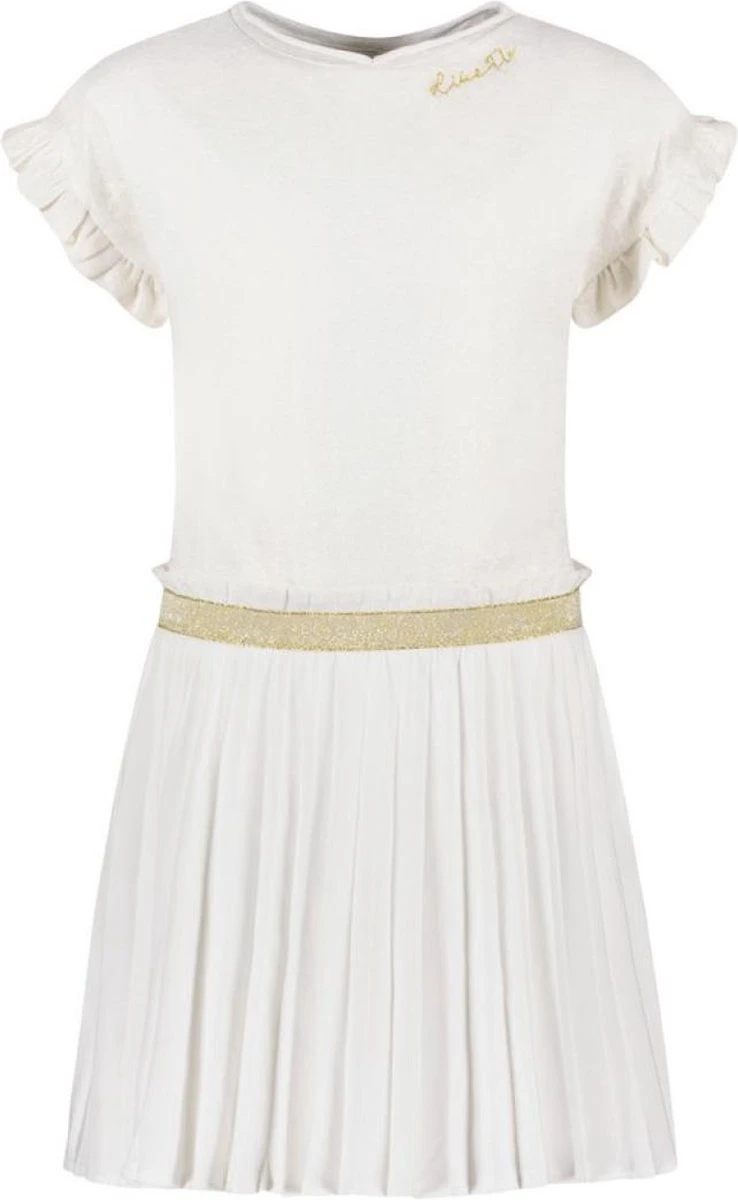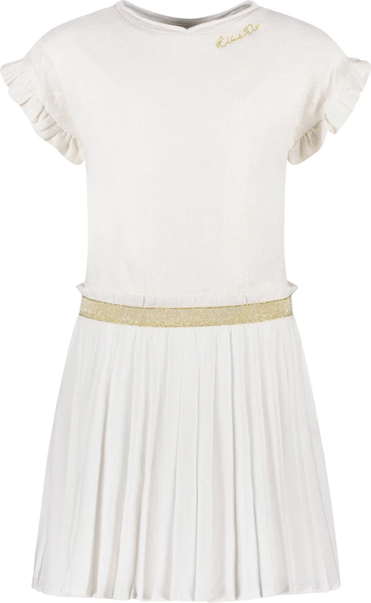Dit heerlijke jurkje is perfect voor een feestje, maar kun je daarnaast ook sportief doordragen. De top is van een zachte off white slub jersey met een subtiele gouden glitter glans en bronzen LIKE FLO borduur langs de hals. De plissé rok van off white jersey is afgewerkt met een gouden elastiek in de taille. Style hem af met een ons gouden imi leren jasje of sportiever met een denim jasje.