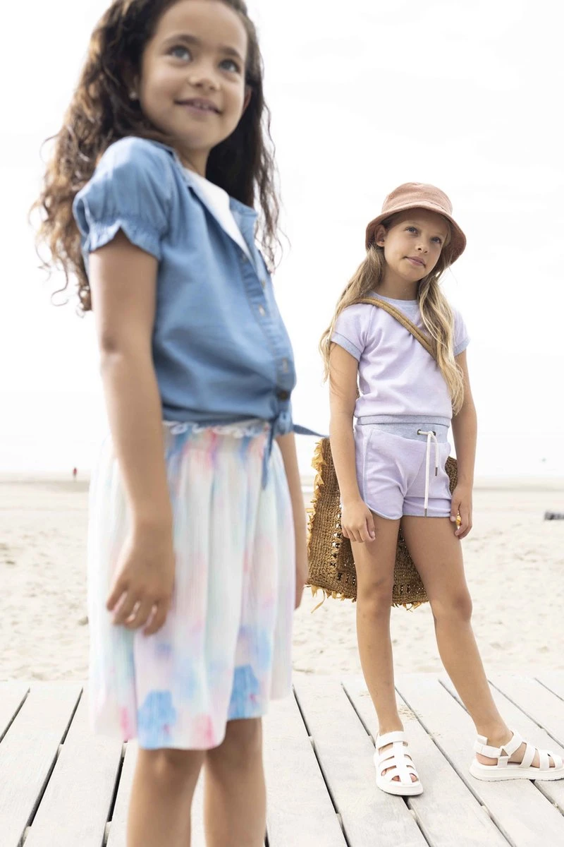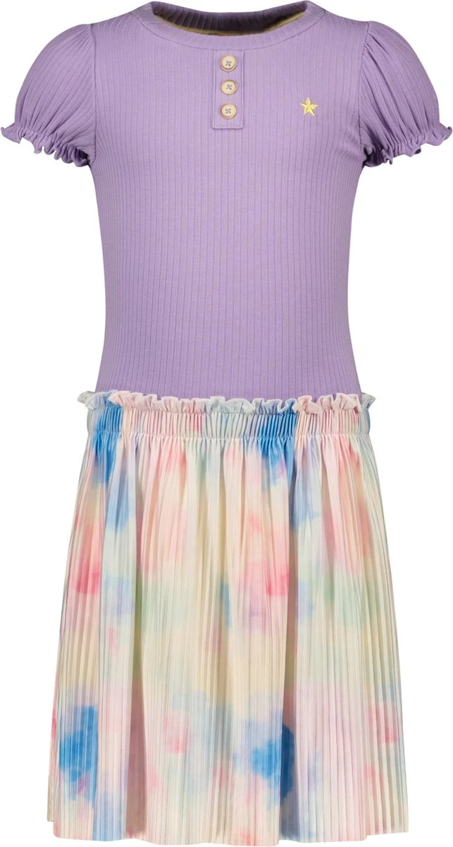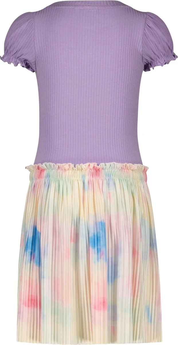 Jurkje met rib top gedeelte en tie-dye rok gedeelte van Like Flo. Het jurkje heeft een lila bovenkant met een ronde hals en korte mouwen. Het item is uniek door de print bij het rokgedeelte. Hoe leuk en zomers is dit jurkje?! Draag met open schoentjes en je meisje is ready to go!