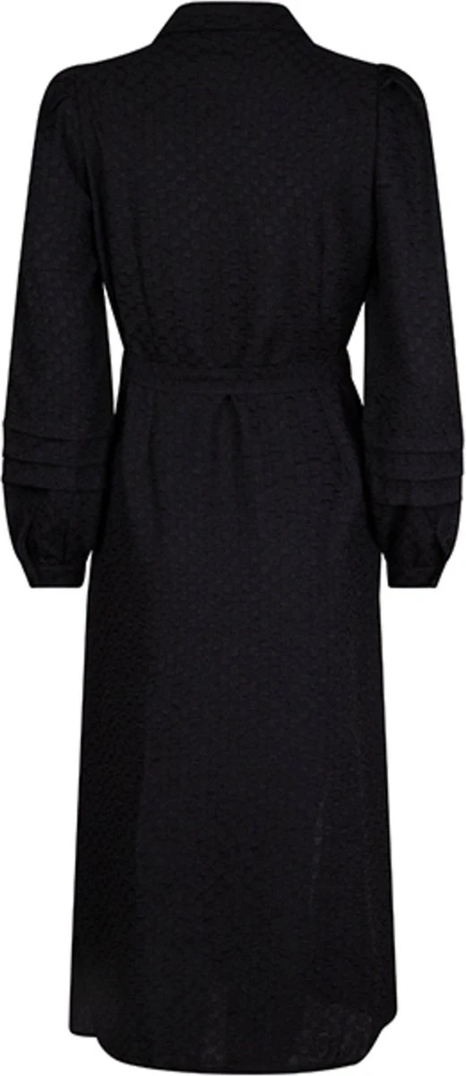 Gestructureerde jurk van Lofty Manner met een polyester voering. De lange mouwen hebben een dun manchet met een knoopje. Dit model heeft een puntkraag met een rij beklede knopen hieronder. In de zij is een blinde ritssluiting geplaatst. De jurk heeft een totale lengte van 120 cm en heeft twee splitten van 35 cm aan de voorkant bij maat S. Handwas, Lauw strijken max 110°c, Machinewas 30°c, Niet bleken, Niet wringen