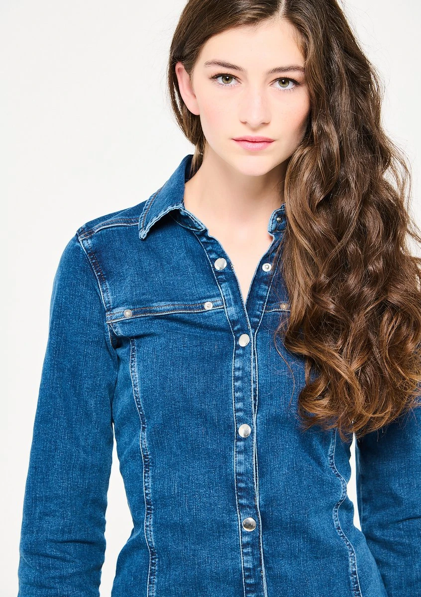 Overhemd jurk van denim Knoopsluiting van boven tot onder Decoratieve naadvoering Kraag Eco-wash: This product has been washed with low-impact chemicals, less water and energy consumption.
