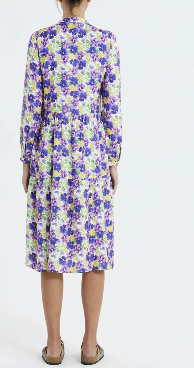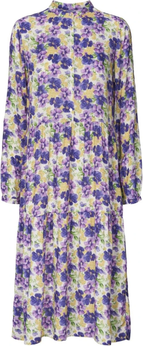 Jurk in vrolijke bloemenprint. De jurk heeft lange mouwen en sluit met knoopjes bovenaan.