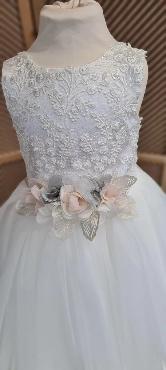 Om de middel zit een band met organza bloementjes waardoor u de taille nog iets meer kunt accentueren (veiligheidsspeldjes,bloemetjes kunnen uitgehaald worden) .