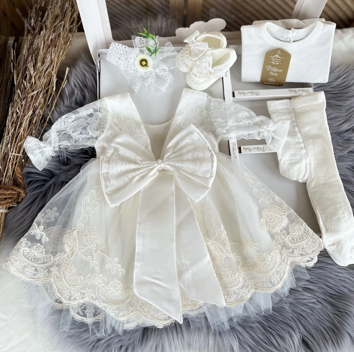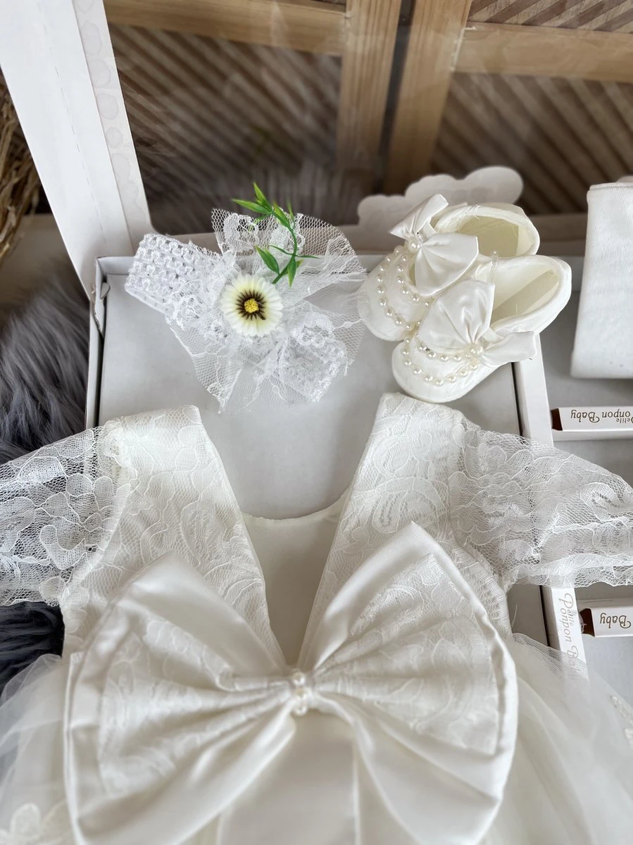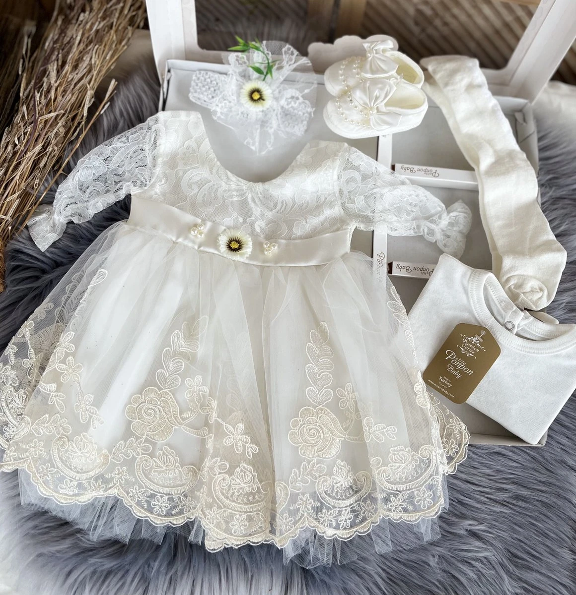 - prachtige feestjurk met hoofdbandje,onderhemd met lange mouwen,kousenbroek en pantoffeltjes verpakt in een luxe geschenkdoos