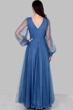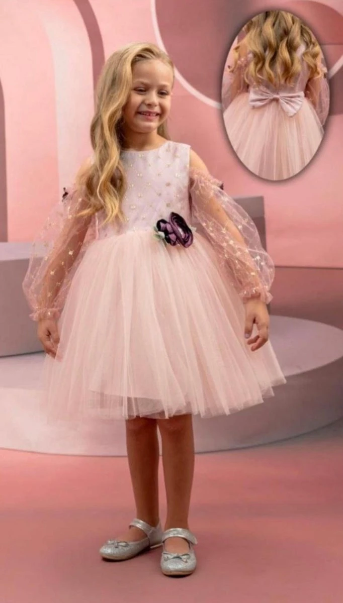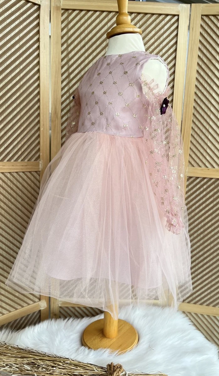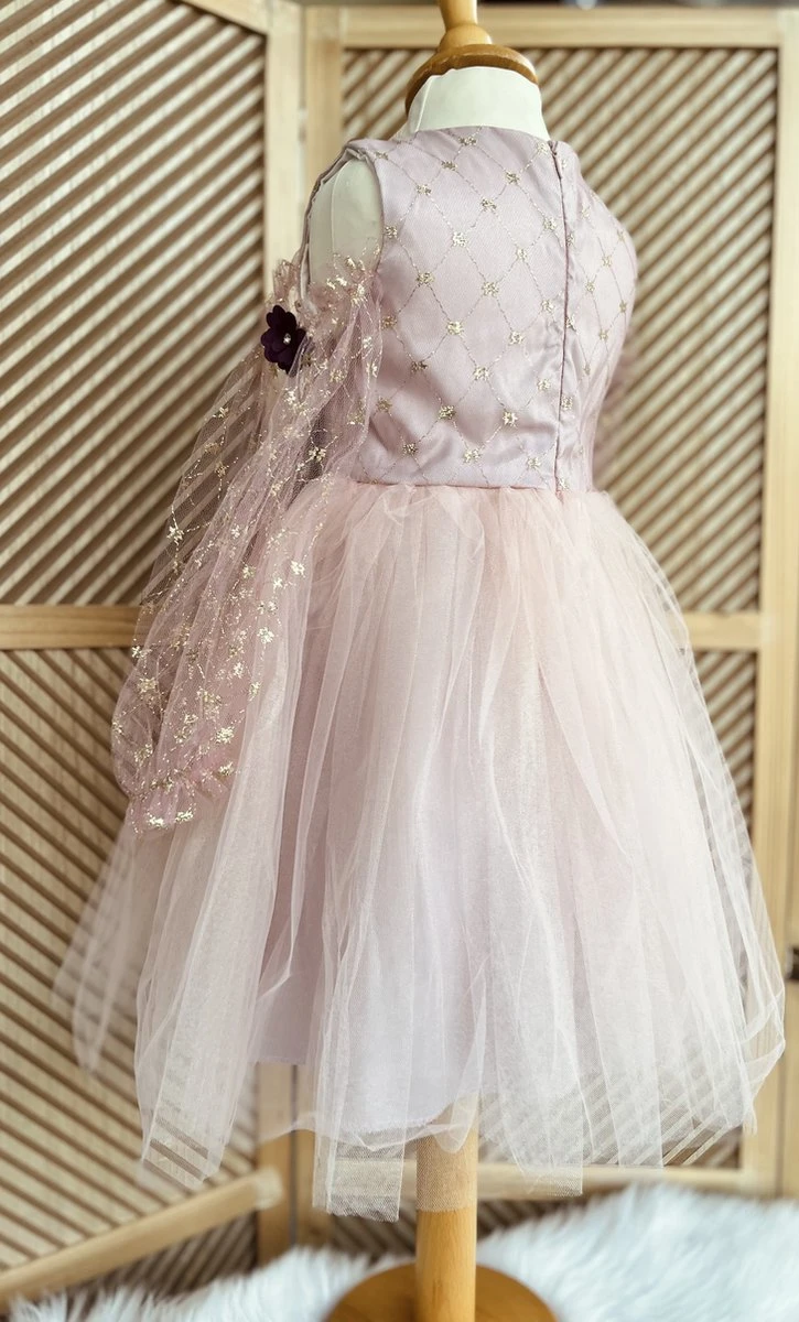 De jurk heeft lange mouwen van tule met glitters en paarse bloemetjes.(bisschop mouwen met uitgesneden opening)