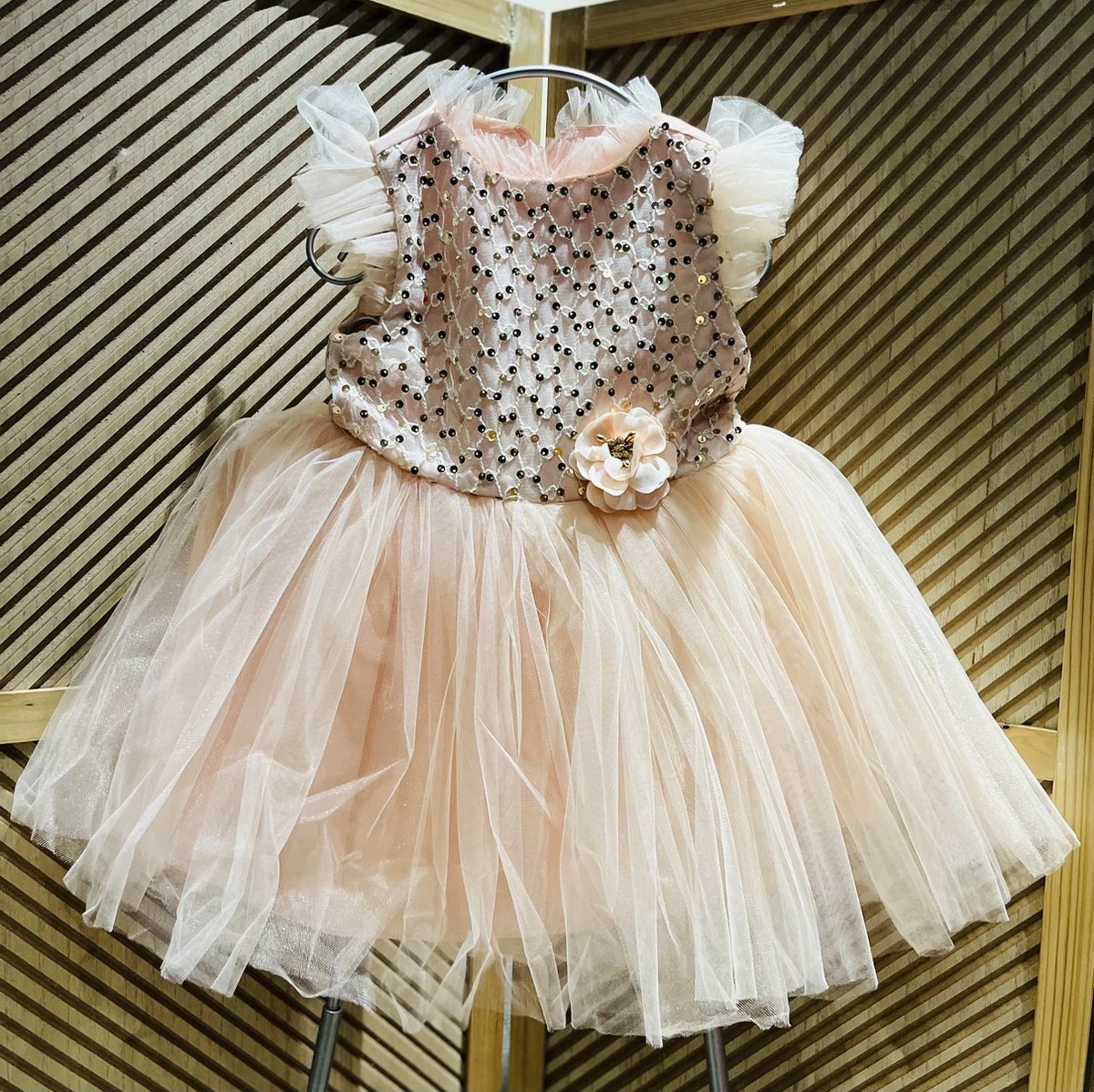 De combinatie van tule, bloemetje en pailletten geeft de jurk buitengewone elegantie.