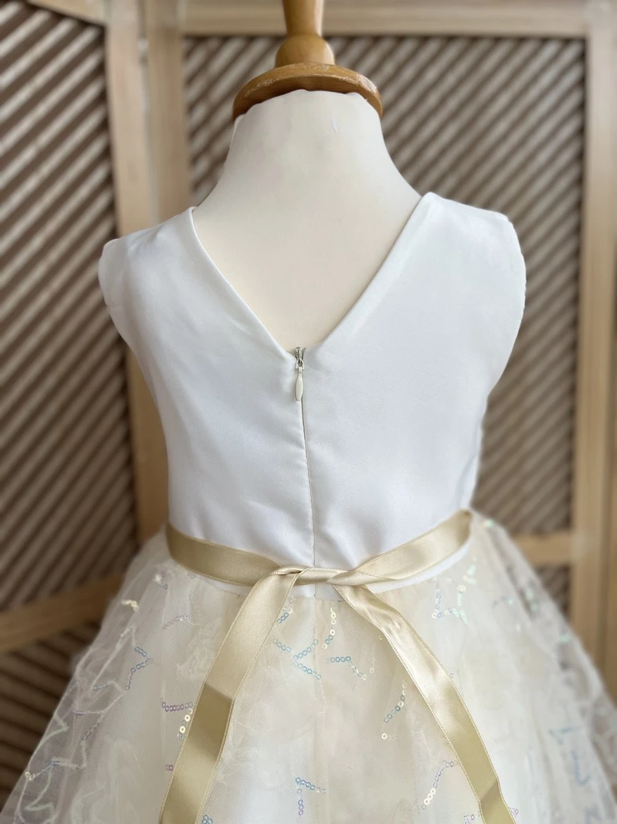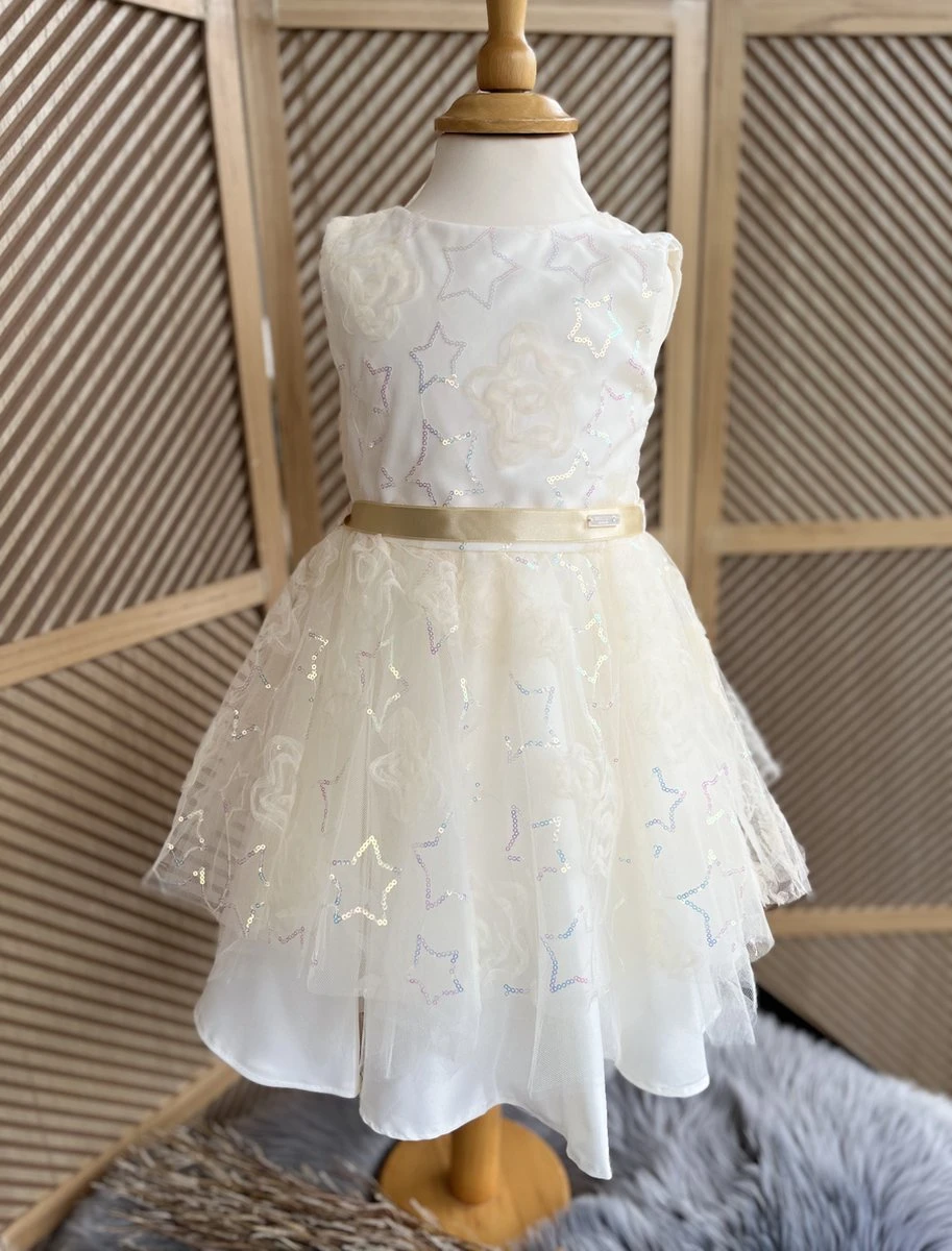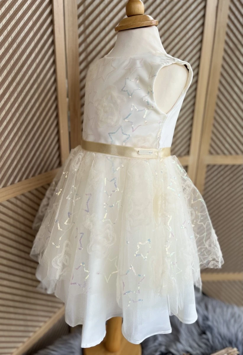 Zeer mooie schattige tule jurk ,de jurk heeft een gouden sierlijke strik en prachtige sterren design uit glitters op het lijfje.(acherkant rug is effen)