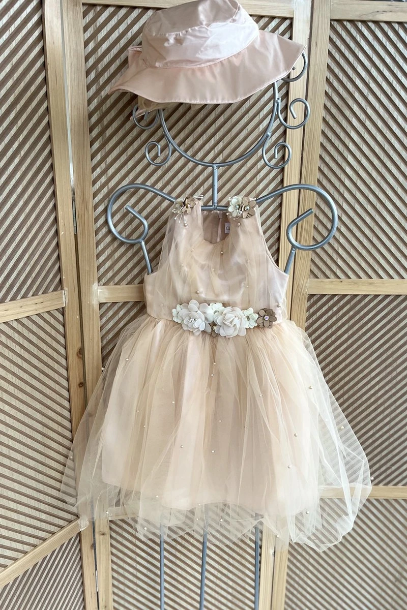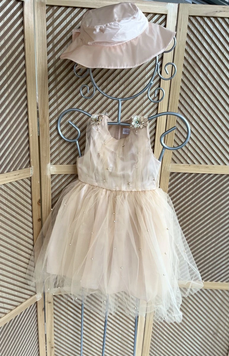 Een tweedelig setje voor meisjes bestaande uit een tule jurkje en bijpassende satijnen hoed. Zeer mooie schattige tule jurk ,de jurk heeft aan de taille en schouder sierbloemetjes met steentjes (allemaal vast met veiligheidsspeldjes)