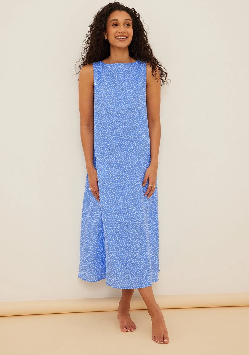Soepelvallende midi-jurk met open rug en open rug. Blauwe print met witte bloemen.