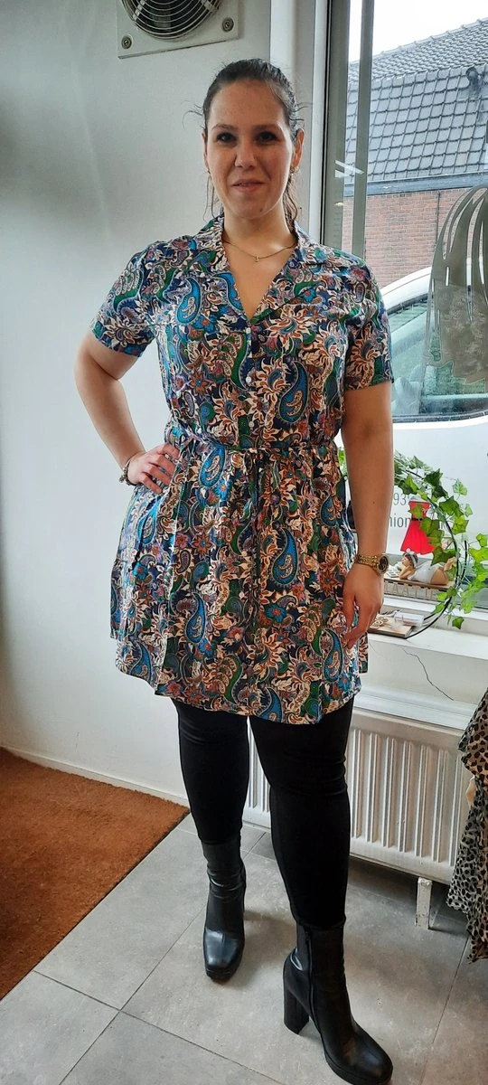 Jurk met een frisse kleurige fantasieprint van het merk Only Carmakoma. Jurk is uitgevoerd met een blouse kraag, aan de voorzijde voorzien van sluiting door middel van knopen en een aantrekkoord rondom de middel om eventueel een leuke taille te maken.