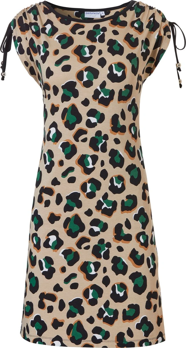 De jurk heeft een ronde hals. De jurk heeft trektouwtjes aan de mouwen waardoor deze gemakkelijk omhoog en omlaag gedaan kunnen worden. Zo kun je er een vlot mouwloos jurkje van maken en mocht het wat kouder zijn dan kunnen de mouwen ook omlaag. De print van het jurkje is een vrolijke animal print gecombineerd in verschillende kleuren.