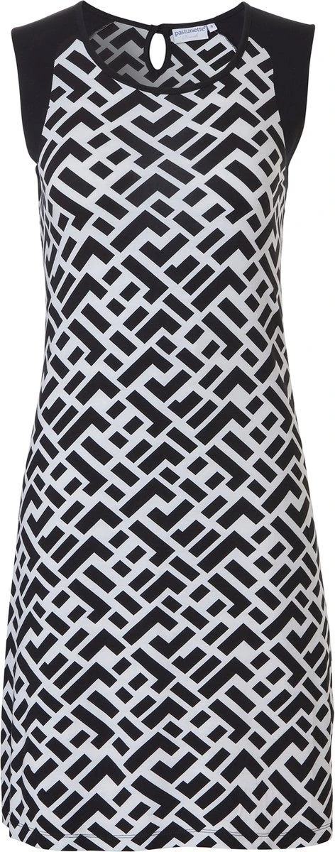 De jurk heeft een ronde hals met zwarte uni stukken op de schouders. Vanwege een knoopsluiting aan de achterkant kan de jurk gemakkelijk aan en uit worden gedaan. De jurk is in een grafisch dessin gecombineerd in de kleuren zwart met wit.