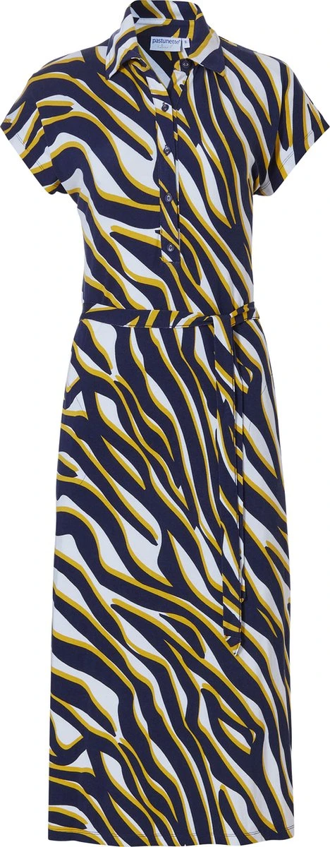 De jurk bevat een kraag met knoopsluiting tot de het middel. Hierdoor is de jurk gemakkelijk aan en uit te doen. Door de borstzakjes en de ceintuur kan deze jurk lekker vlot gedragen worden. De print van het jurkje is een speelse zebra print gecombineerd in verschillende kleuren. De lengte van deze jurk is 125 cm.