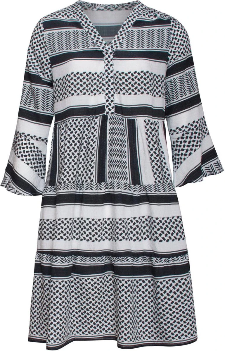 Deze ruimvallende A-lijn stroken jurk is zeer comfortabel en luchtig. Met een driekwart wijduitlopende mouw en een V-hals heerlijk zomers. Draag deze jurk met leuke slippers of sandalen voor een complete look.