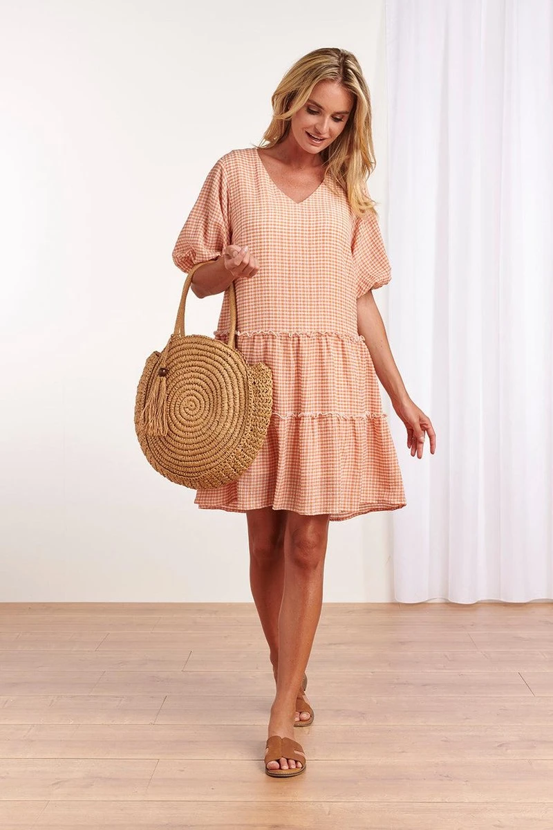 Deze soepelvallende jurk is een toevoeging aan je garderobe! Het model heeft een ronde V-hals en speelse pofmouwen. De jurk loopt wijd uit een heeft verschillende deelnaden met ruches in het rokgedeelte voor een zwierig effect.
