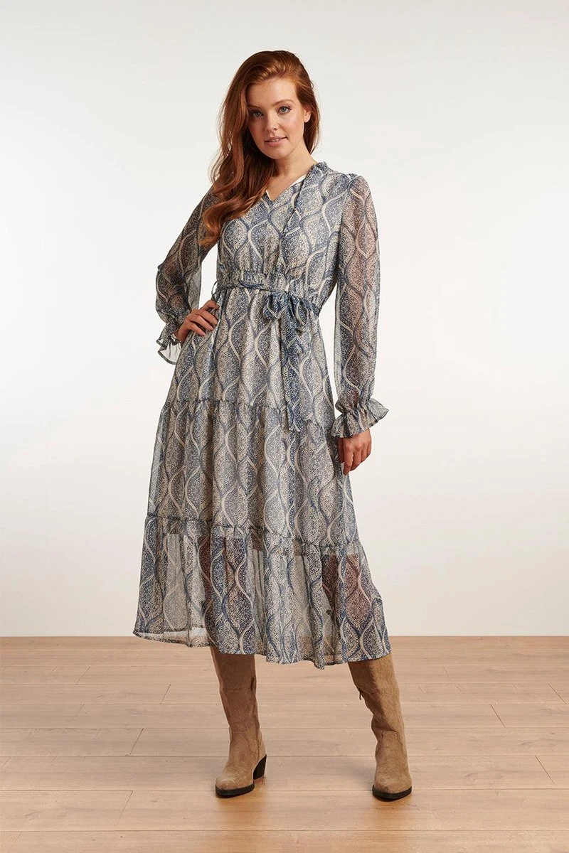 Deze zwierige maxi-jurk heeft lange pofmouwen met elastiek en een ruffel aan de onderkant. Het model heeft een strikceintuur en een vrouwelijke V-hals met ruches. Onderaan de V-hals zitten twee koordjes die als klein strikje geknoopt kunnen worden. Het rokgedeelte loopt wijd uit en bestaat uit twee deelnaden.