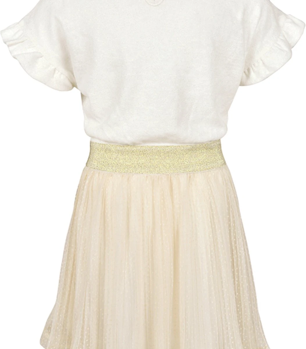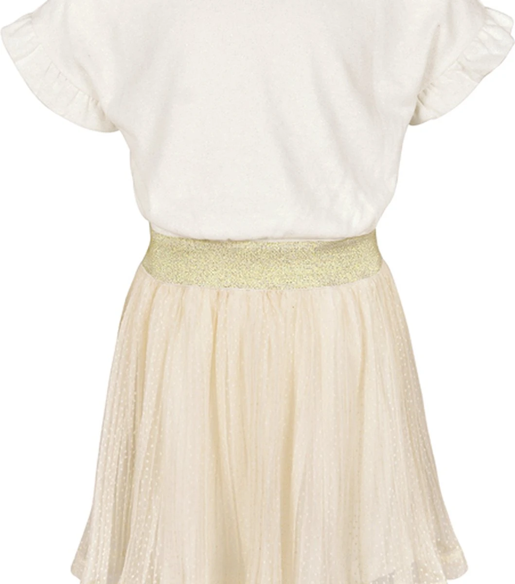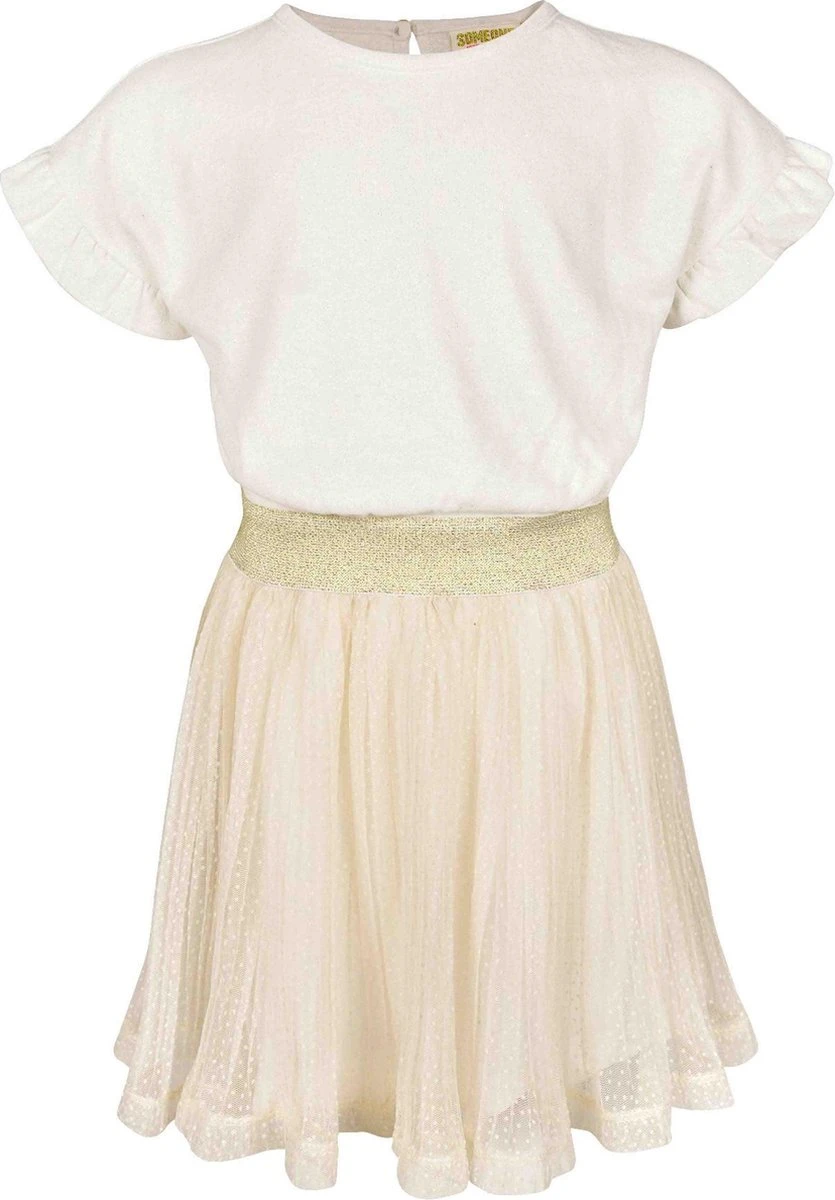 Je voelt je als een prinsesje met deze mooi jurk van Someone! Het jurkje heeft een ronde hals en korte mouwen met ruches. De rok heeft tule met stipjes en bij de taille een elastische goudkleurige band.