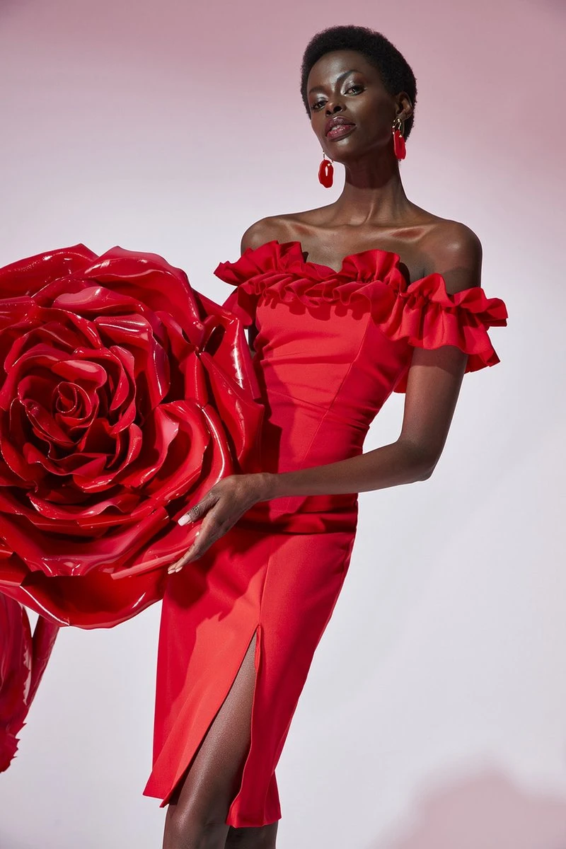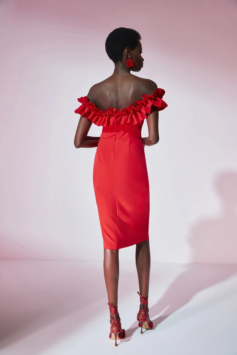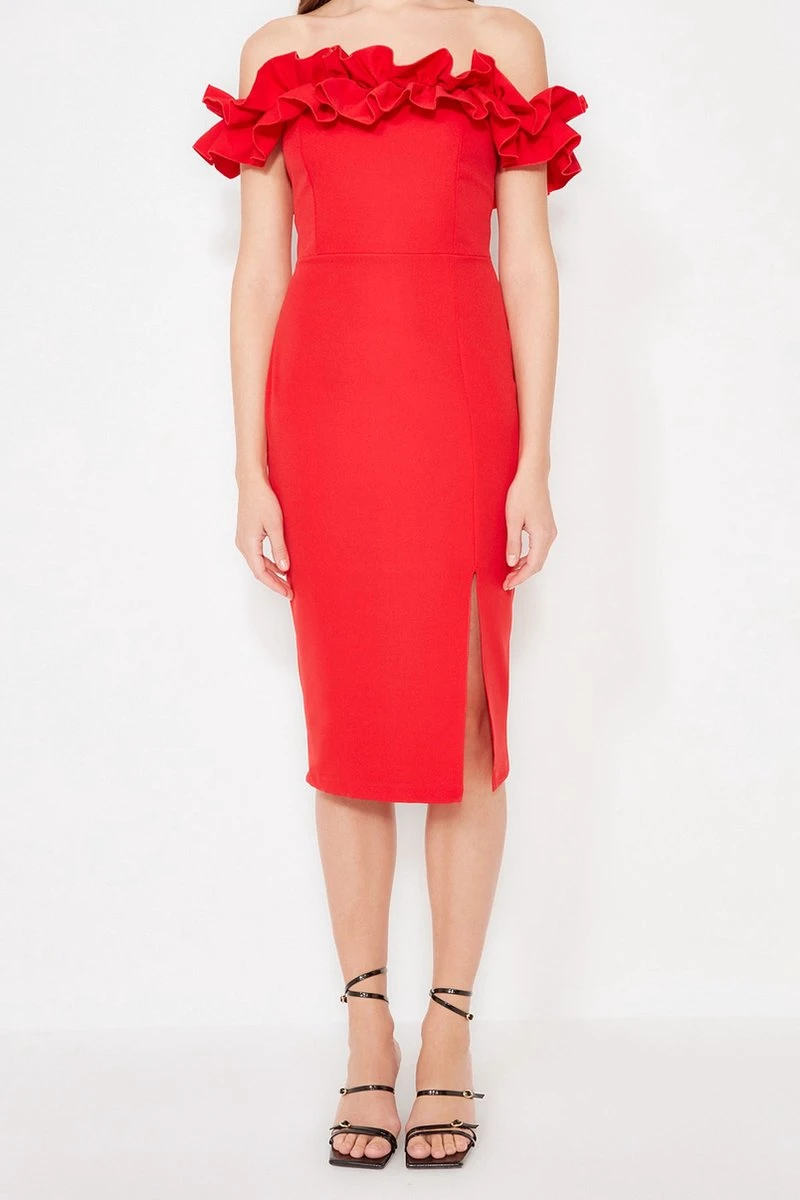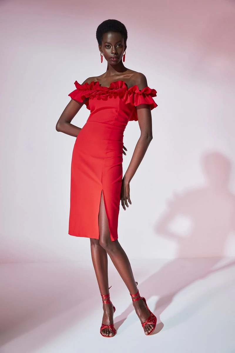 Trendyol Vrouwen Gepofte/ruche Mouw Carmen Kraag Bodycon Jurk