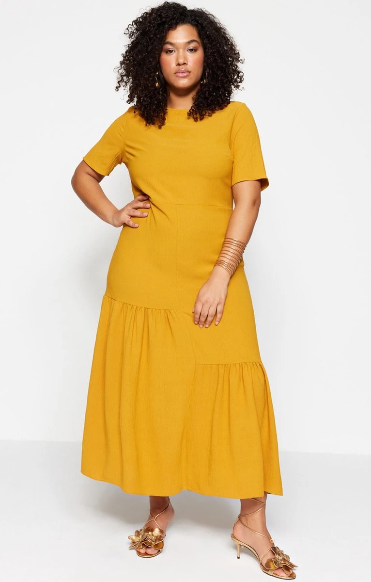 Trendyol Vrouwen Standaard Mouw Ronde Hals Ruche Zoom Grote Maten Jurk