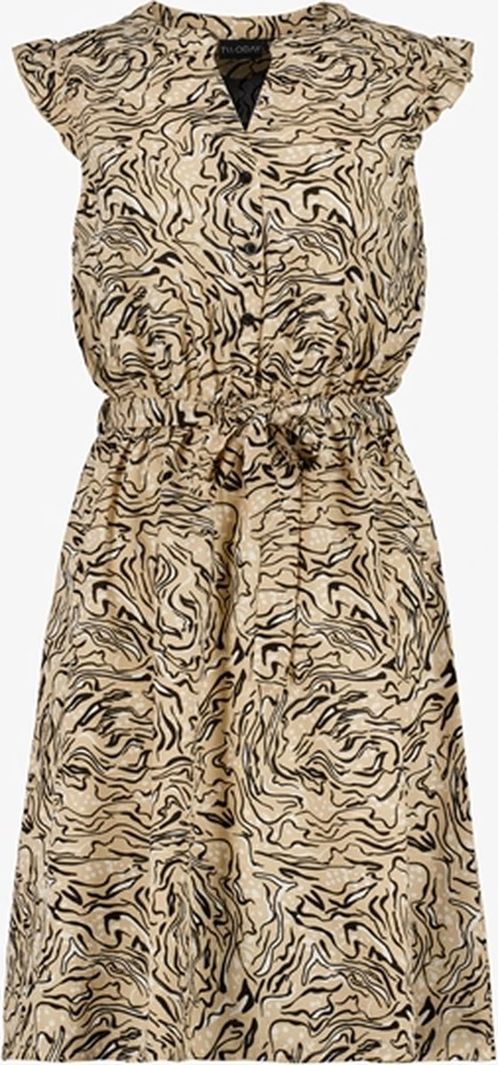 Beige jurk van TwoDay voor dames. Deze zomerse jurk heeft een subtiele v-hals en details op de schouders. De jurk heeft knoopjes aan de voorzijde en een ceintuur in de taille. De jurk valt over de knie en is goed te combineren met een sportieve sneaker of stijlvolle instapper. De jurk is gemaakt van 96% polyester en 4% elastaan.