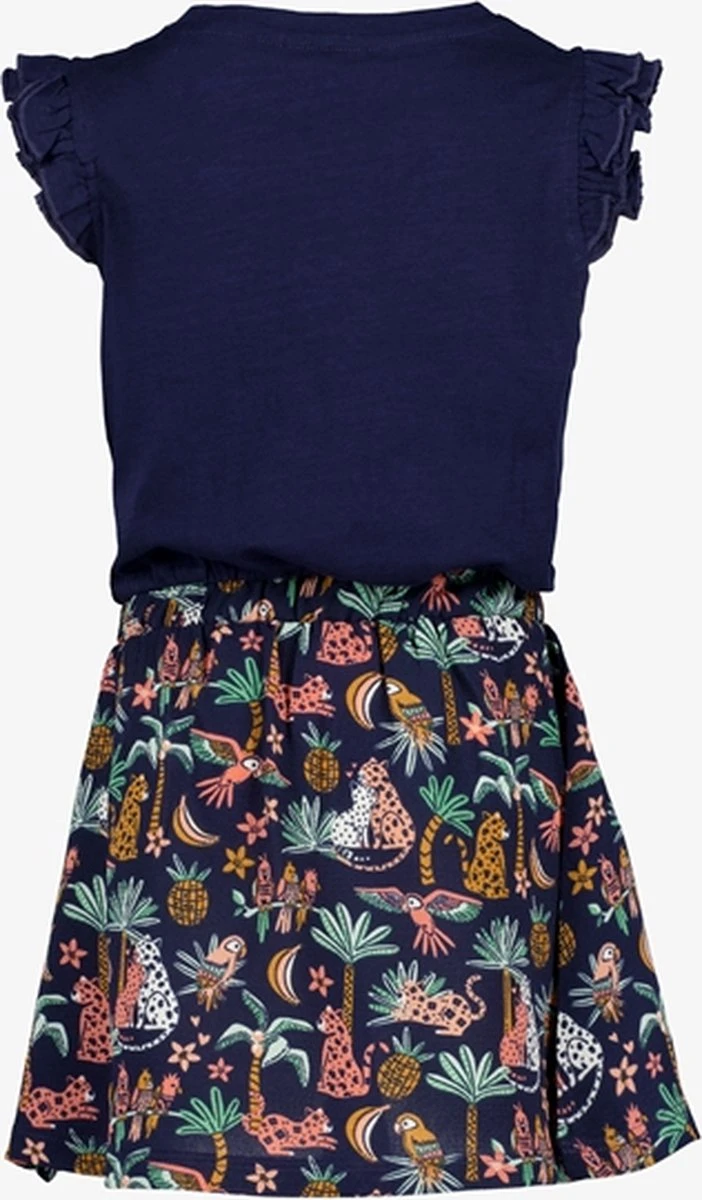 Blauwe TwoDay jurk voor meisjes. Voorzien van een ronde hals, korte vlindermouwtjes en een elastiek in de taille. Dit mooie jurkje heeft een tekstopdruk op de borst en een vrolijke jungleprint op de onderzijde. Bij dit jurkje krijg je een bijpassend scrunchie! Gemaakt van 100% polyester.