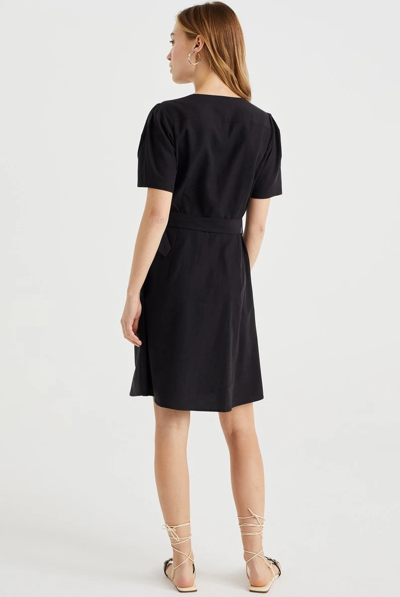 Een regular fit jurk van een lycellmix met een ceintuur en een knoopsluiting. Het model heeft een V-hals en korte mouwen. De jurk valt boven de knie.