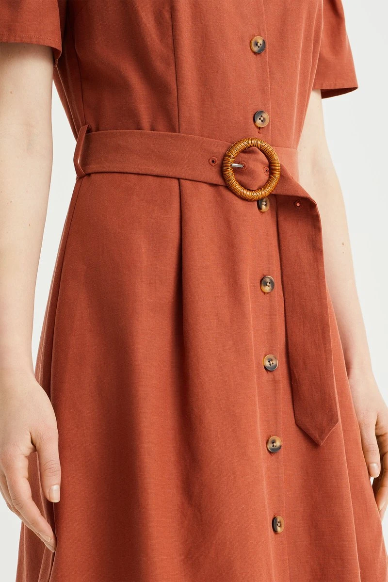 Een regular fit jurk van een lycellmix met een ceintuur en een knoopsluiting. Het model heeft een V-hals en korte mouwen. De jurk valt boven de knie.
