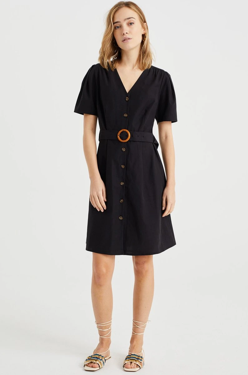 Een regular fit jurk van een lycellmix met een ceintuur en een knoopsluiting. Het model heeft een V-hals en korte mouwen. De jurk valt boven de knie.