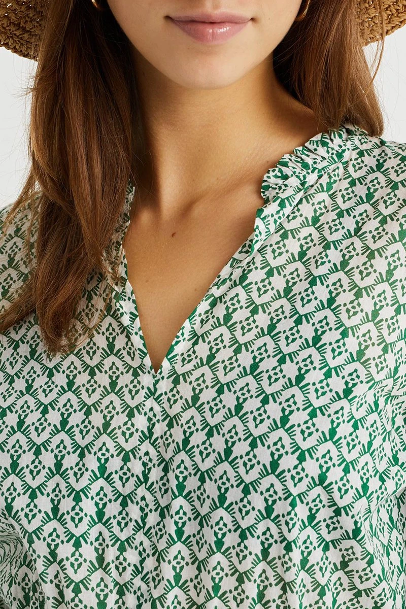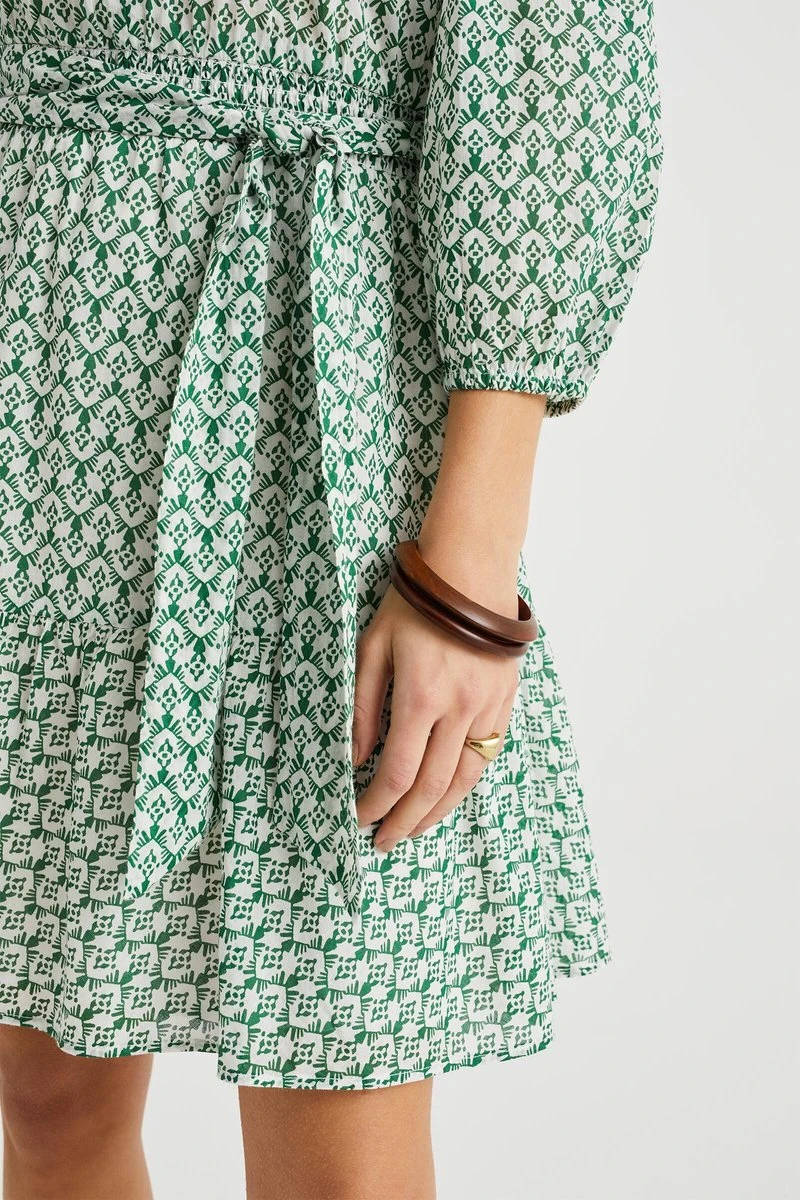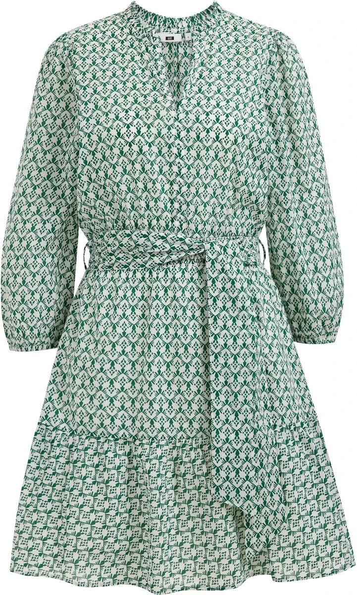 Een regular fit jurk van katoen met een dessin, ruches en strikceintuur. Het model heeft een V-hals, lange mouwen en elastische taille.