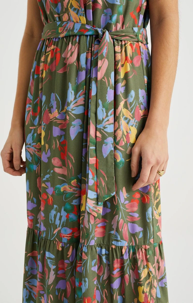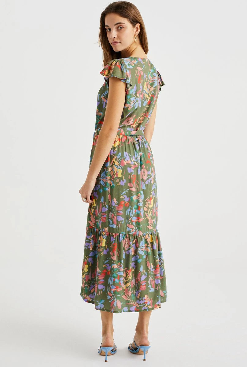 Een regular fit jurk van viscose met een dessin en strikceintuur. Het model heeft een V-hals en korte mouwen. De jurk valt over de knie en heeft volant aan de onderkant.