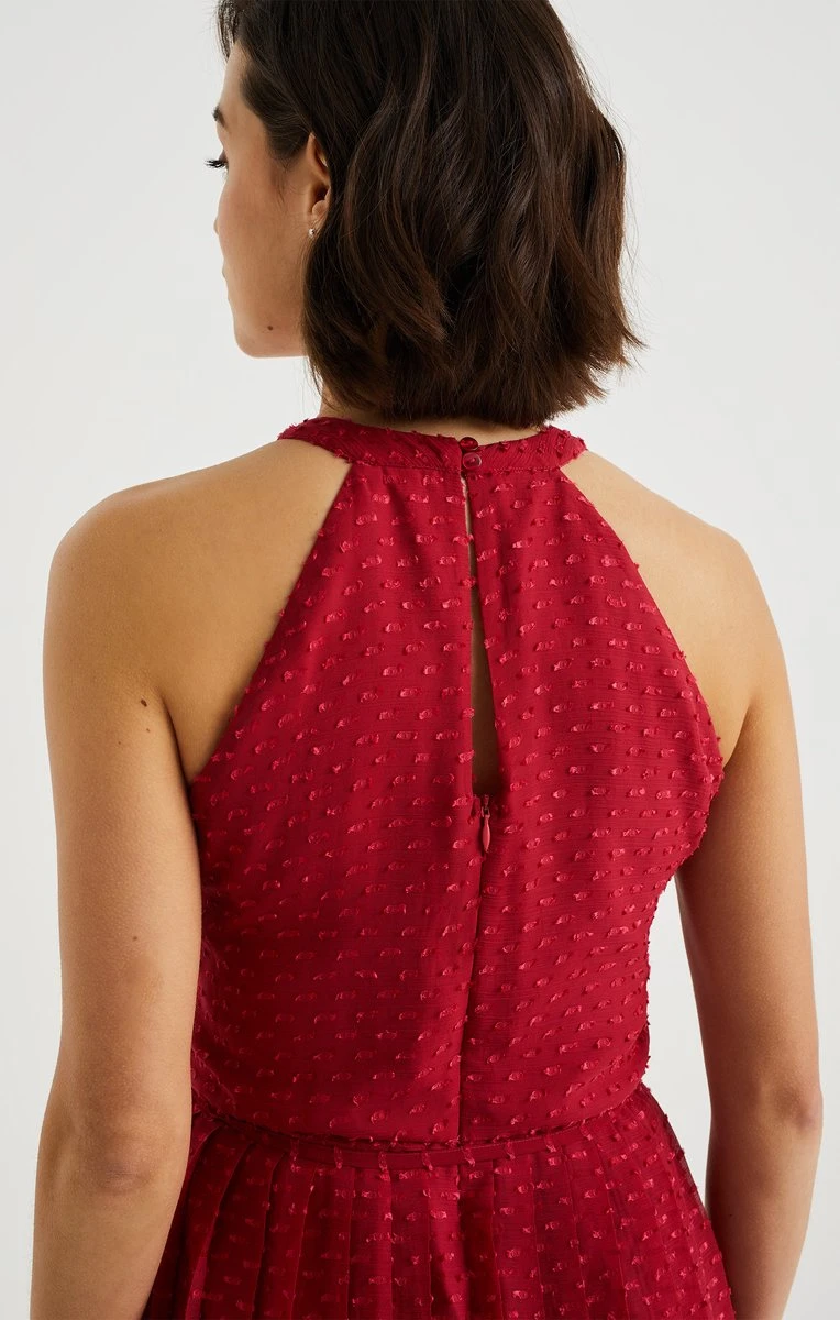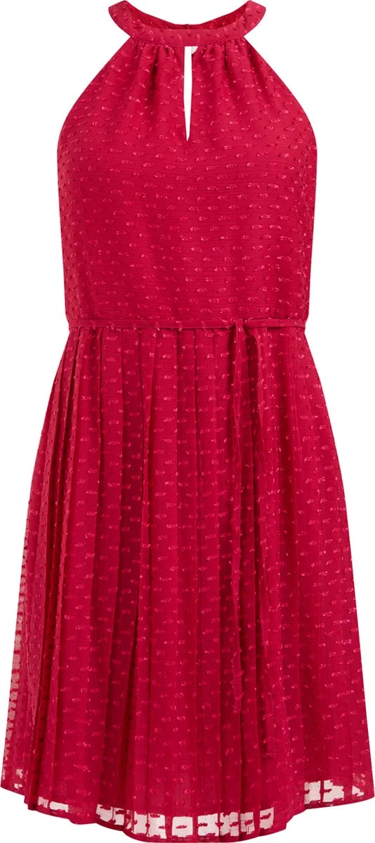 Een regular fit jurk van geweven kwaliteit met een structuur, strikceintuur en plissé rok. Het model heeft een ronde hals met een knoopsluiting en een blinde ritssluiting.
