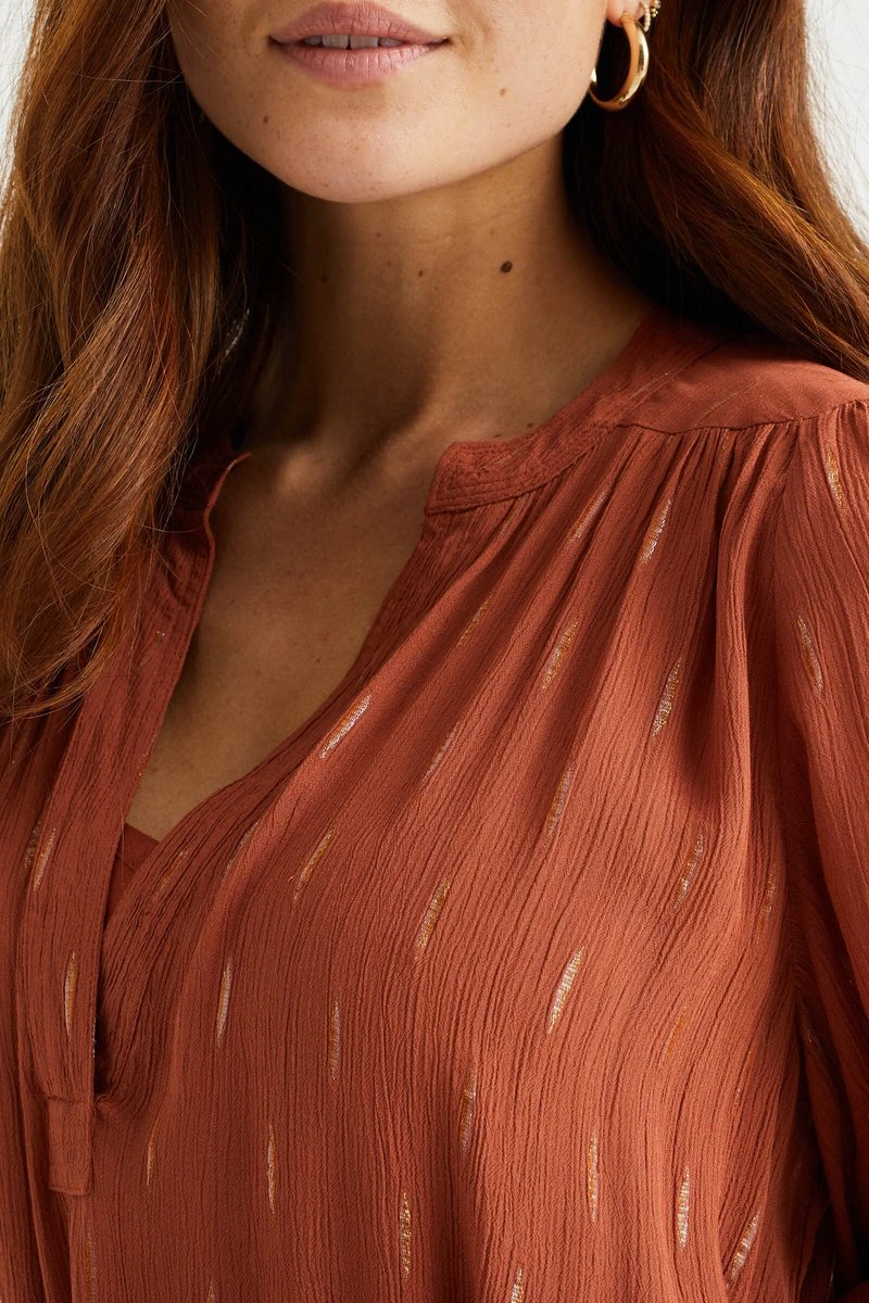 Een regular fit jurk van viscose met een glitterdessin en strikceintuur. Het model heeft een V-hals en lange mouwen. De jurk valt op de enkels.
