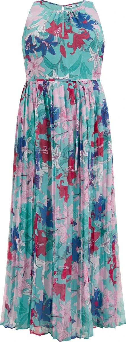 Een regular fit jurk van geweven kwaliteit met een dessin, ceintuur en plissérok. Het model heeft een ronde hals met knoopsluiting en blinde ritssluiting. De jurk valt op de enkels.