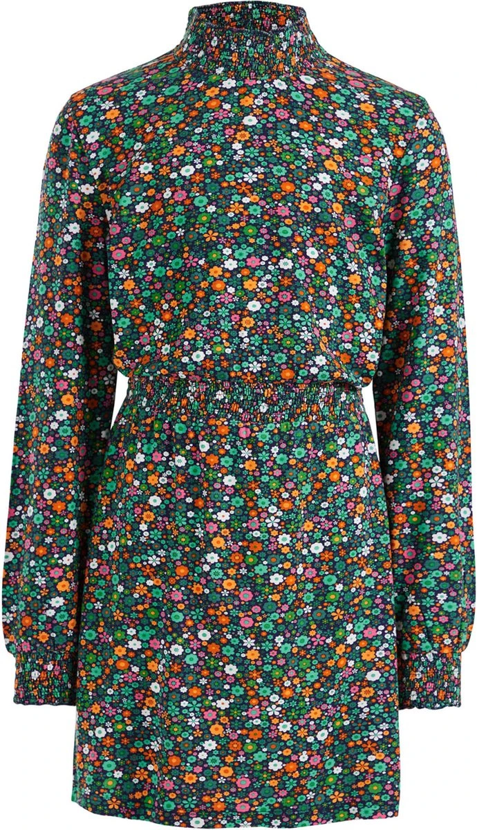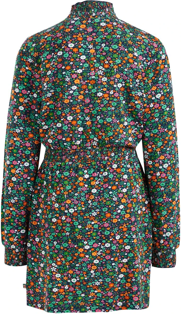 Een regular fit jurk van viscose met toegevoegde stretch, een dessin en smockwerk. Het model heeft een opstaande kraag, lange mouwen en een elastische tailleband.
