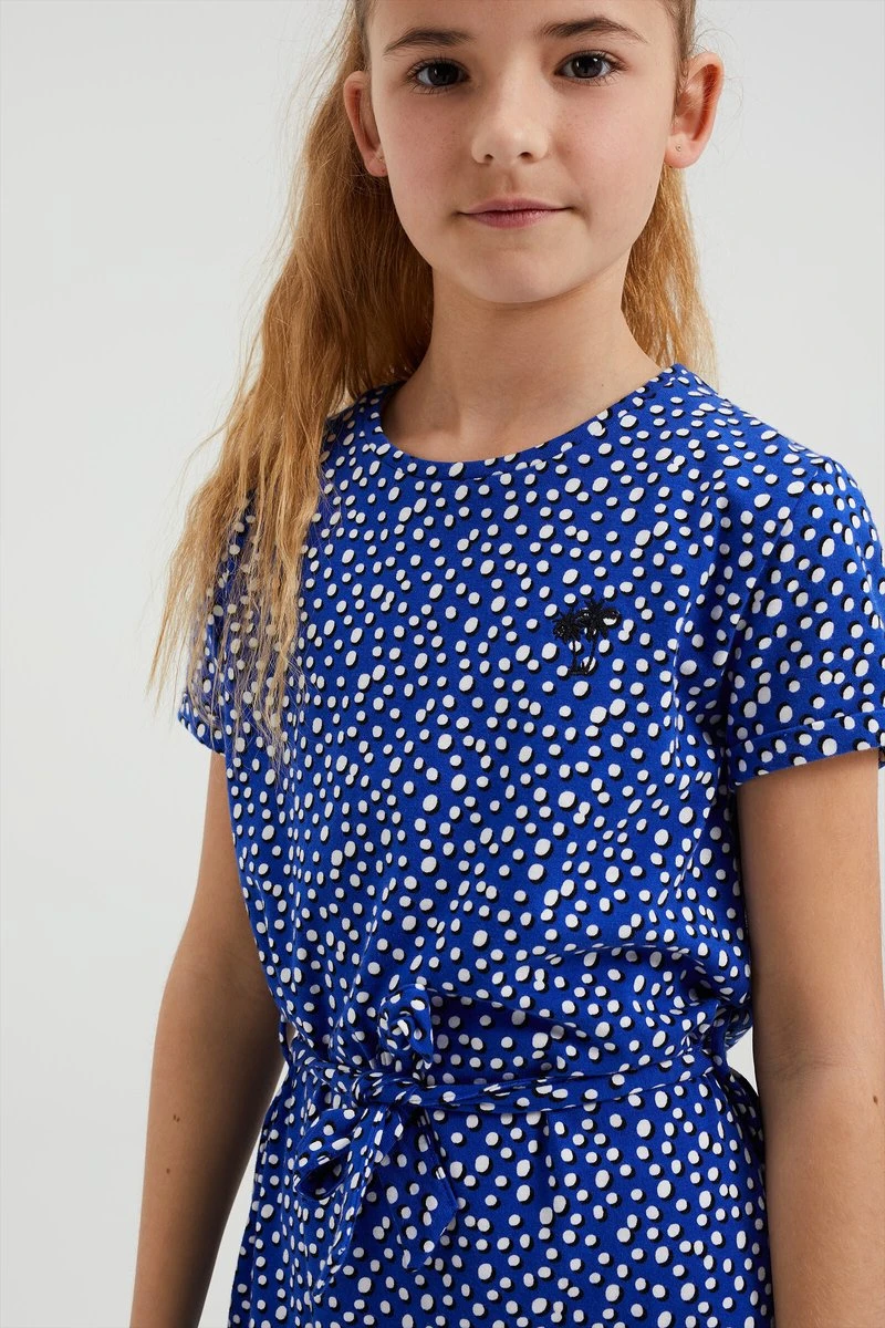 Een regular fit jurk van een katoenmix met een stippendessin, een embroidery en een strikceintuur. Het model heeft een ronde hals en korte mouwen. De jurk heeft een brede strook met volant onderaan de jurk.
