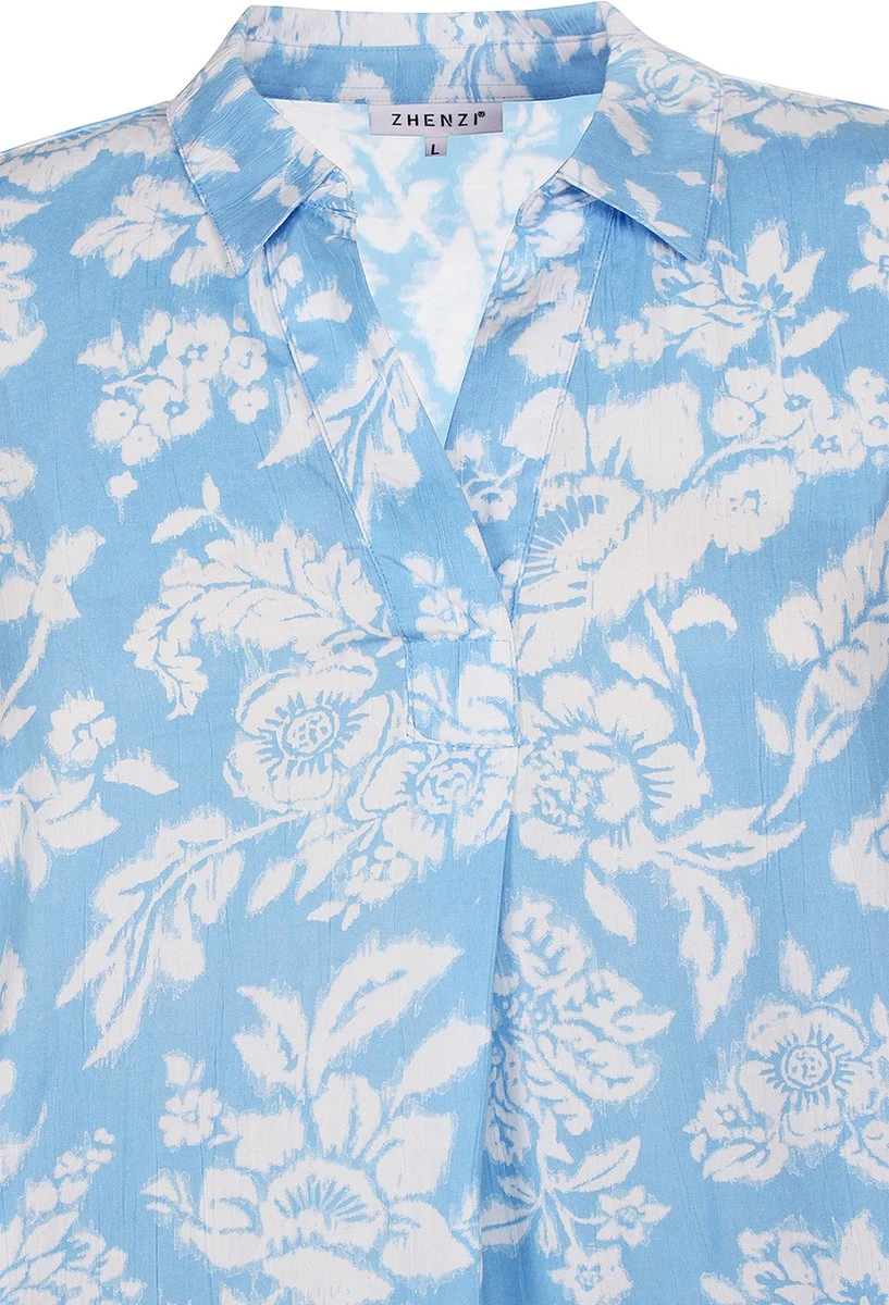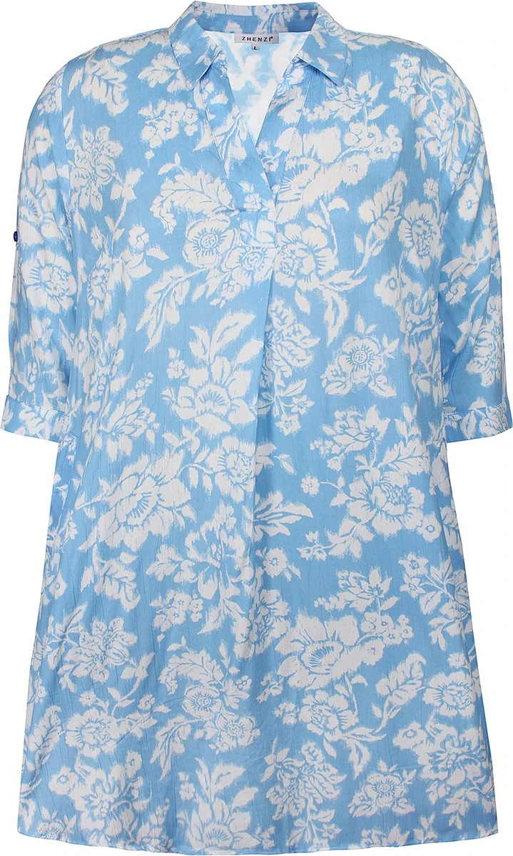 ZHENZI Eco jurk KYDENCE, Maat L=50-52, met een advies prijs van: 69.54. ZHENZI Eco jurk KYDENCE is een super vlot model. Hij heeft een V hals met een kraagje. Onderaan de hals zit een brede plooi, deze geeft ruimte om de buste en buik. In het voorpand zitten paspelzakken. De voorkant is iets korter