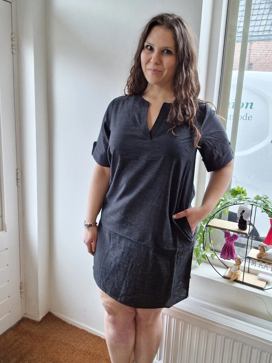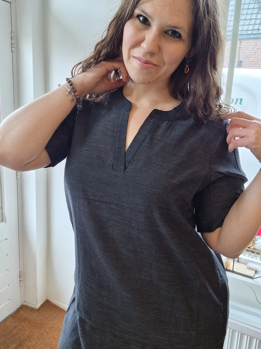 Zoals je van Zhenzi gewend bent een jurk van erg fijne stof die heerlijk draagt. De jurk loopt onder rond en heeft aan de zijkanten een kleine split. Korte mouwen waarvan aan de uiteinden de stof is omgeslagen met een knoopje. De hals is een echte v-hals die mooi is afgewerkt. Heerlijk luchtig in de zomer! De stof schijnt iets door.