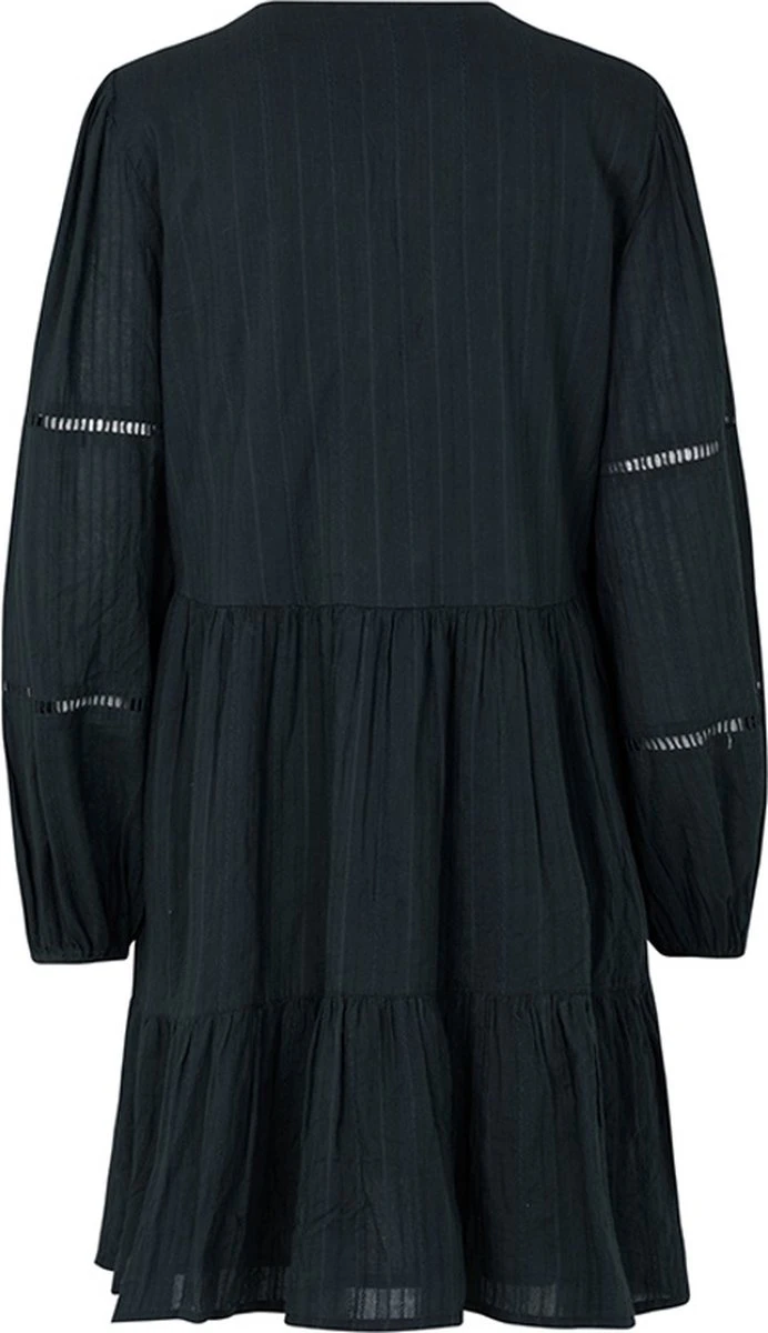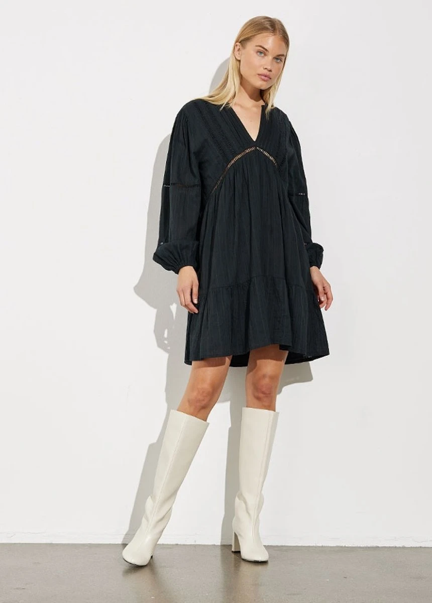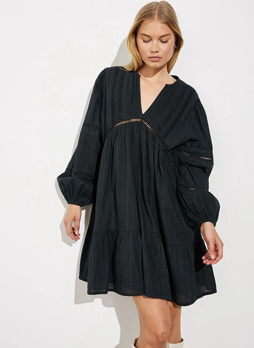 Een zwarte jurk mag niet ontbreken in je garderobe. Deze prachtige midi-jurk van mbyM met structuur past perfect in je voorjaarscollectie. De zwierige zwarte A-lijn jurk heeft lange mouwen met elastische mouw zoomen, een V-hals en mooie opengewerkte details op de mouwen. De midi-jurk heeft een zwarte voering waardoor deze niet doorschijnt. Style de jurk af met mooie sandalen of laarzen.